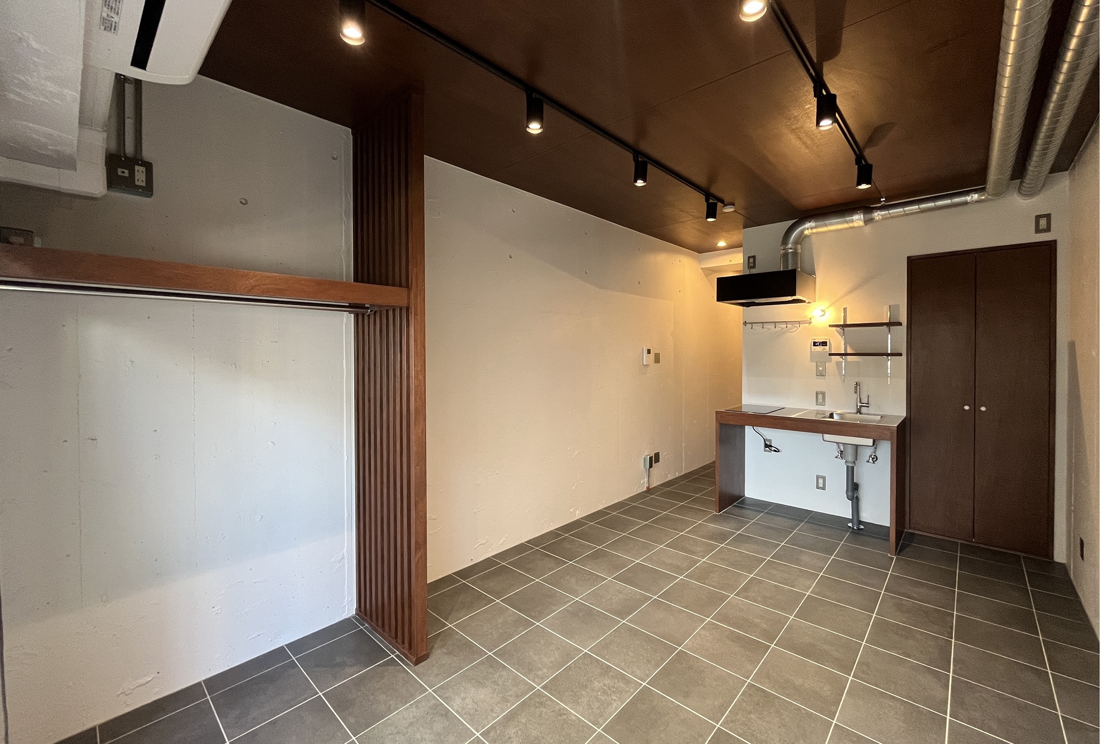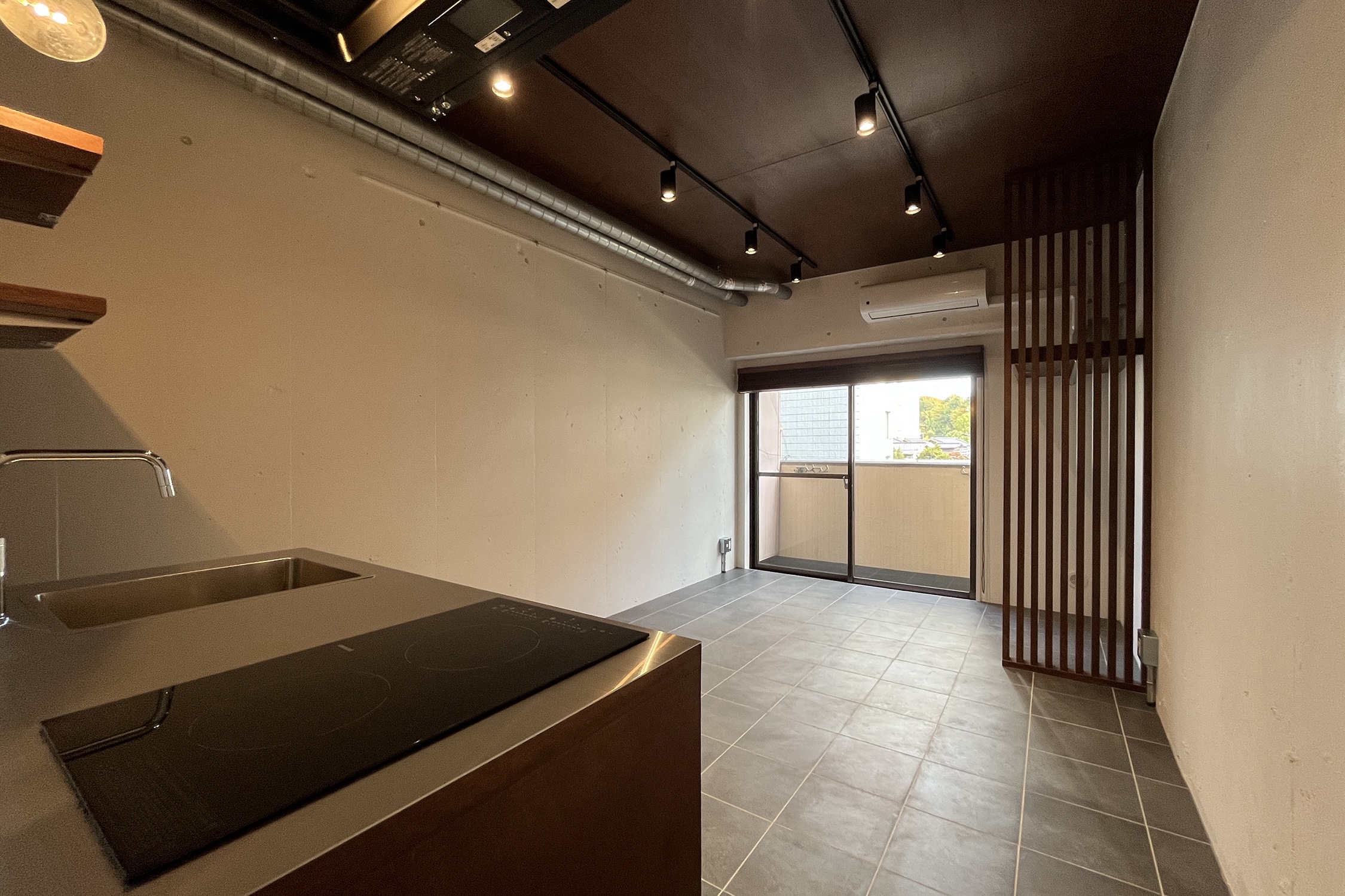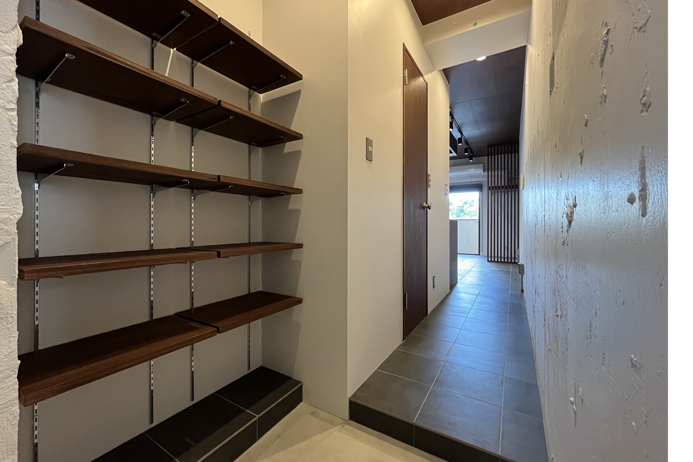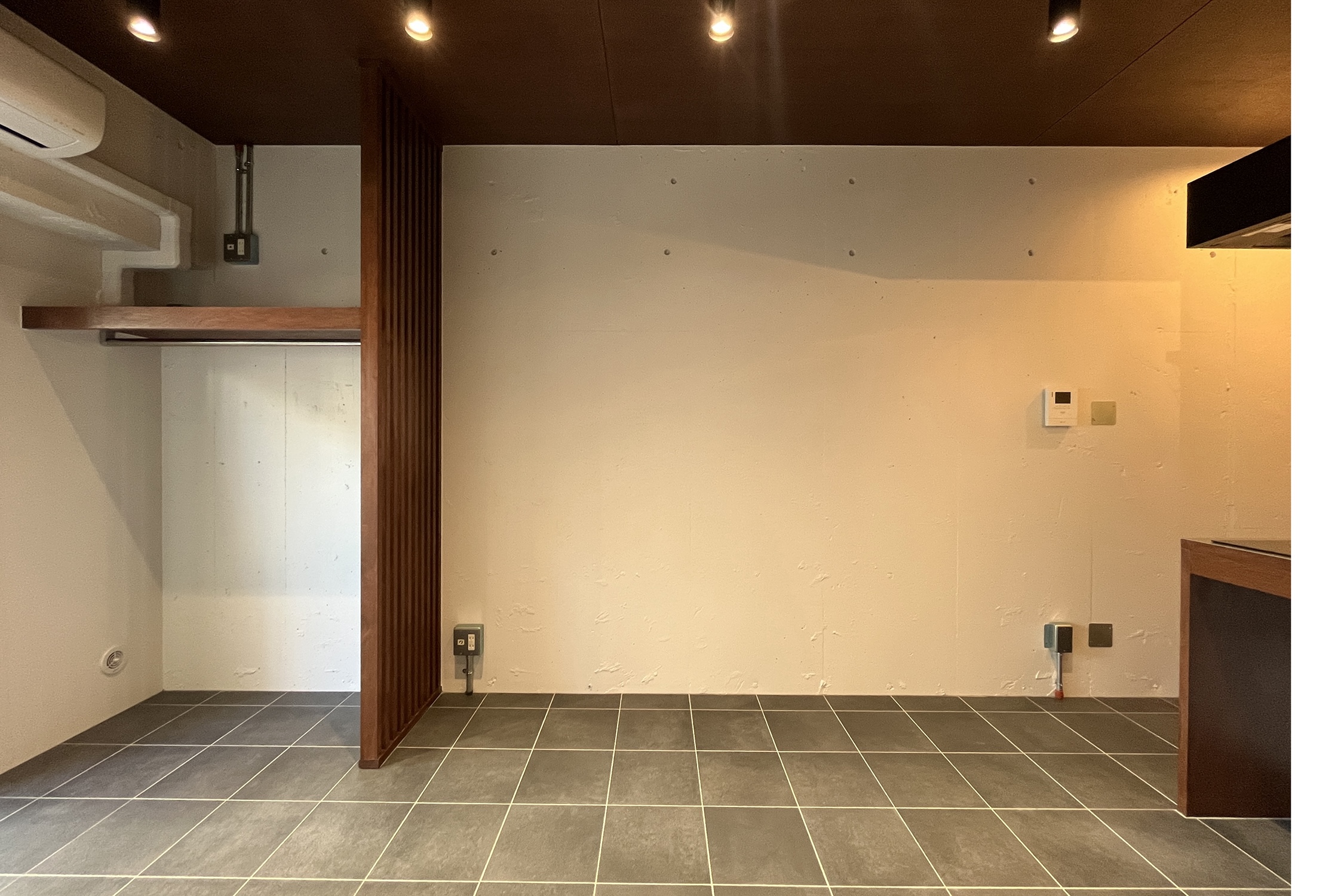 最寄りの駅は「赤羽橋」。「麻布十番」や「芝公園」、東京タワーも徒歩圏内で、東京を感じる街並みです。そんな街に、リノベーションシリーズ「Organic」の部屋があります。玄関を入ると左手にはワイドのあるシューズラックがあり、靴だけでなく玄関を彩るディスプレイなんかもここで実現できそうです。丁寧に貼られたグレーの磁気タイルの床を進むと、南向きの窓から差す光が室内を美しく照らす。ダークブラウンに染色したラワン材を貼った天井によって、ホテルのような、書斎のような、落ち着いた雰囲気を醸し出しています。オープンクローゼットの脇に施したルーバーは廊下からの目隠しにもなるようにデザイン。完成度の高いディテールが心地よい、ホテルライクなお部屋に仕上がりました。