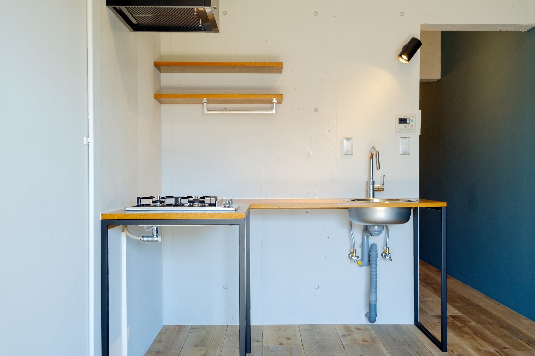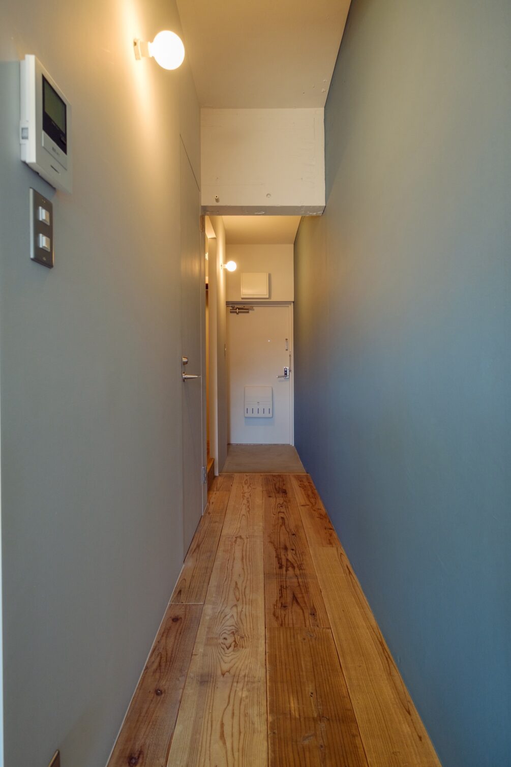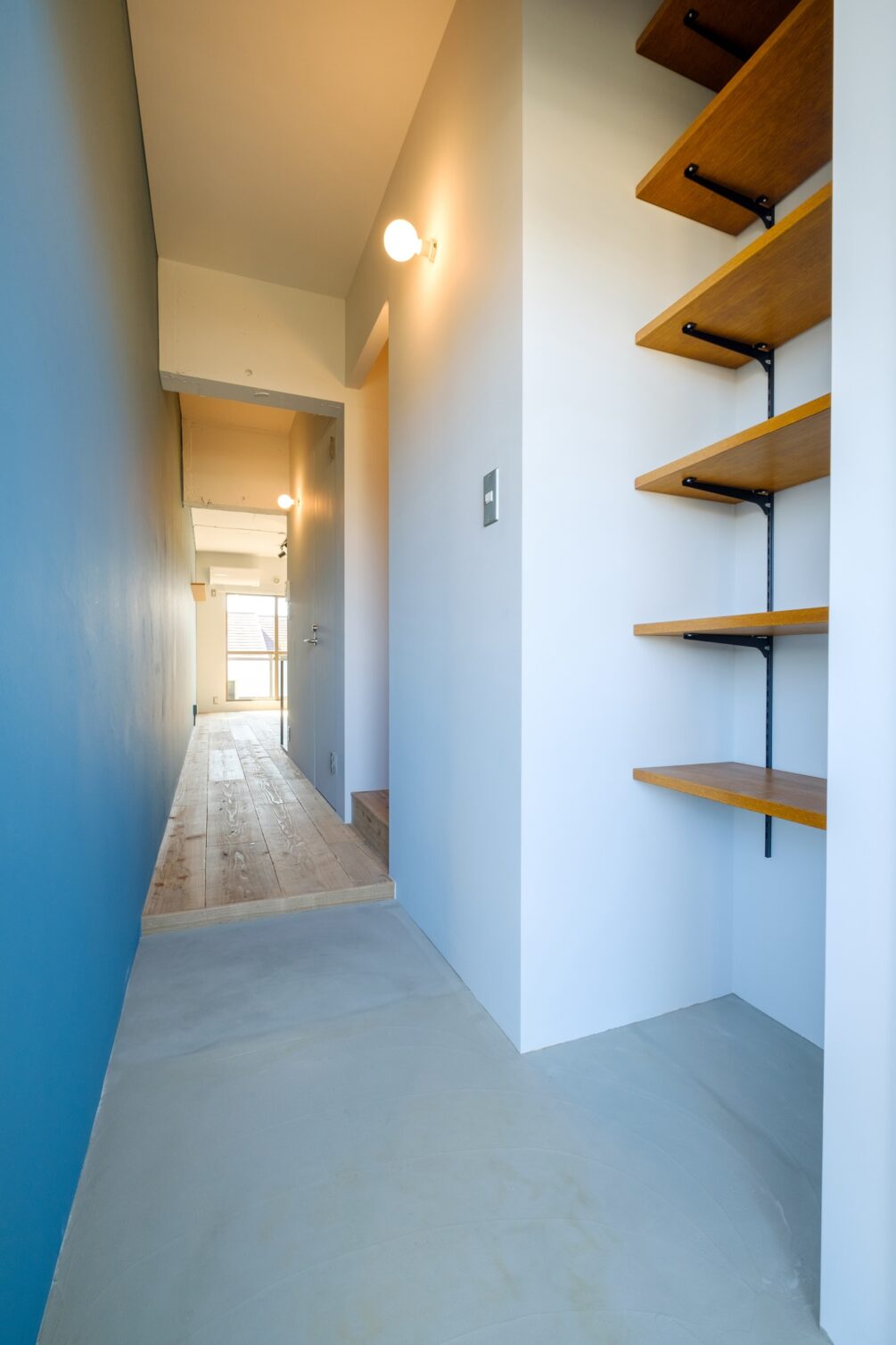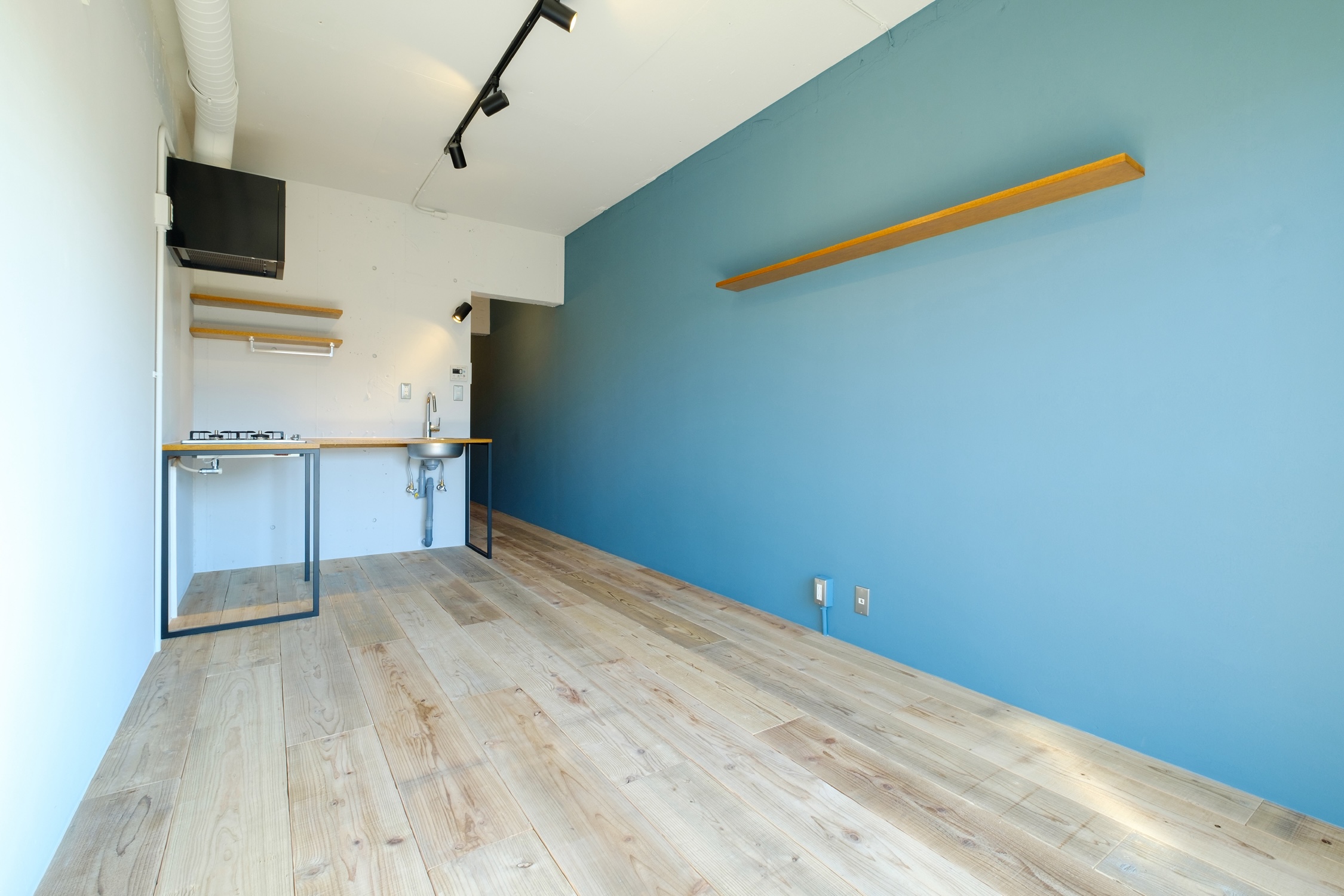 若者を中心に賑わう下北沢の2つ隣、小田急線「梅ヶ丘」は、駅前には買い物に便利な商店街もあり、街並みもきちんと整備され落ち着いた街並み。地元民をはじめわざわざ訪れる人も多いパン屋や、有名寿司の総本店、ちょっと歩けば経堂や豪徳寺へも行けるので世田谷らしいライフスタイルも楽しめます。そんな「梅ヶ丘」に完成したのはリノベーション賃貸「Plain」。一面に施されたアクセントカラーは深みのあるブルー。どこかグレーがかったその色は大人っぽく花を添えてくれます。ライトやキッチンの脚などところどころ黒が効いているのもちょっとメンズライクで良いアクセント。使う度、踏みしめる度に素材ならではの経年変化を楽しめる足場板の床や、広々なウォークインクローゼット、飾り棚にはお気に入りを並べたり…まるでカフェのようなカラー部屋と、世田谷暮らしを堪能してみては?