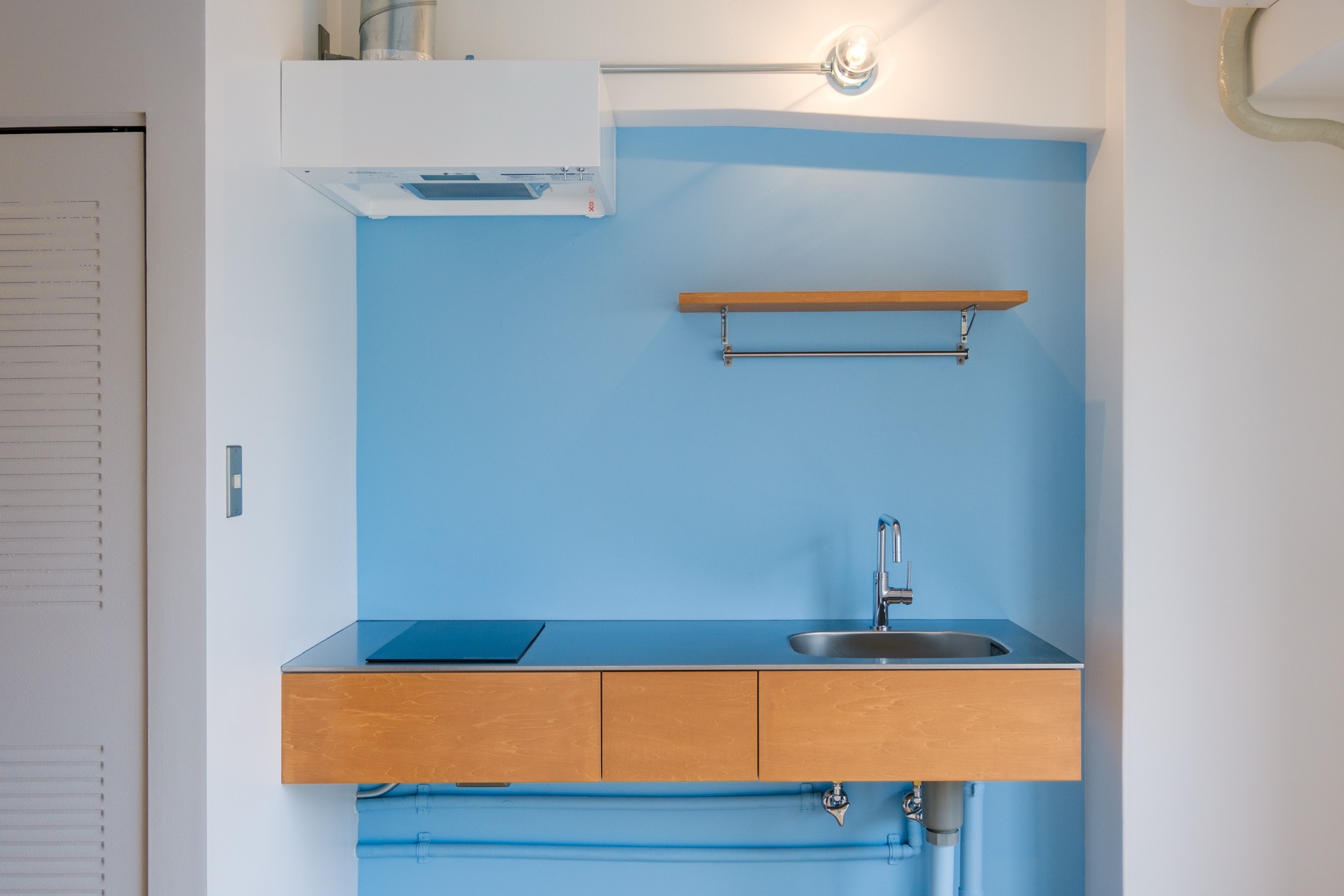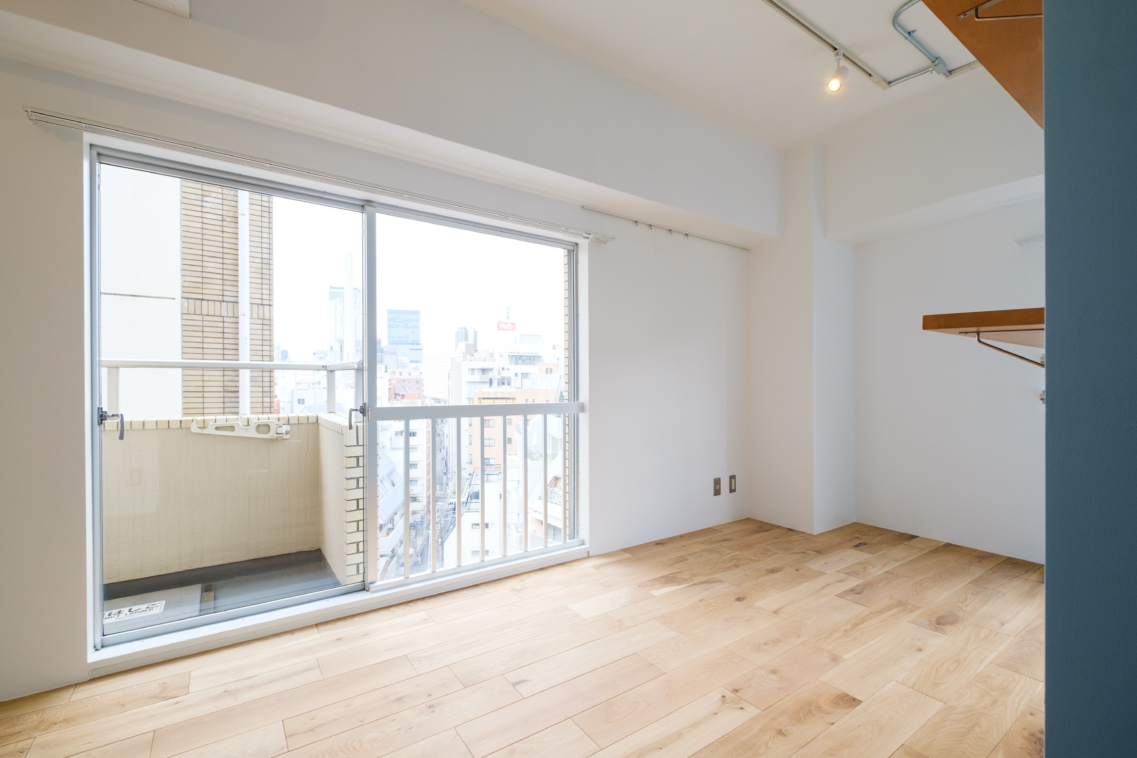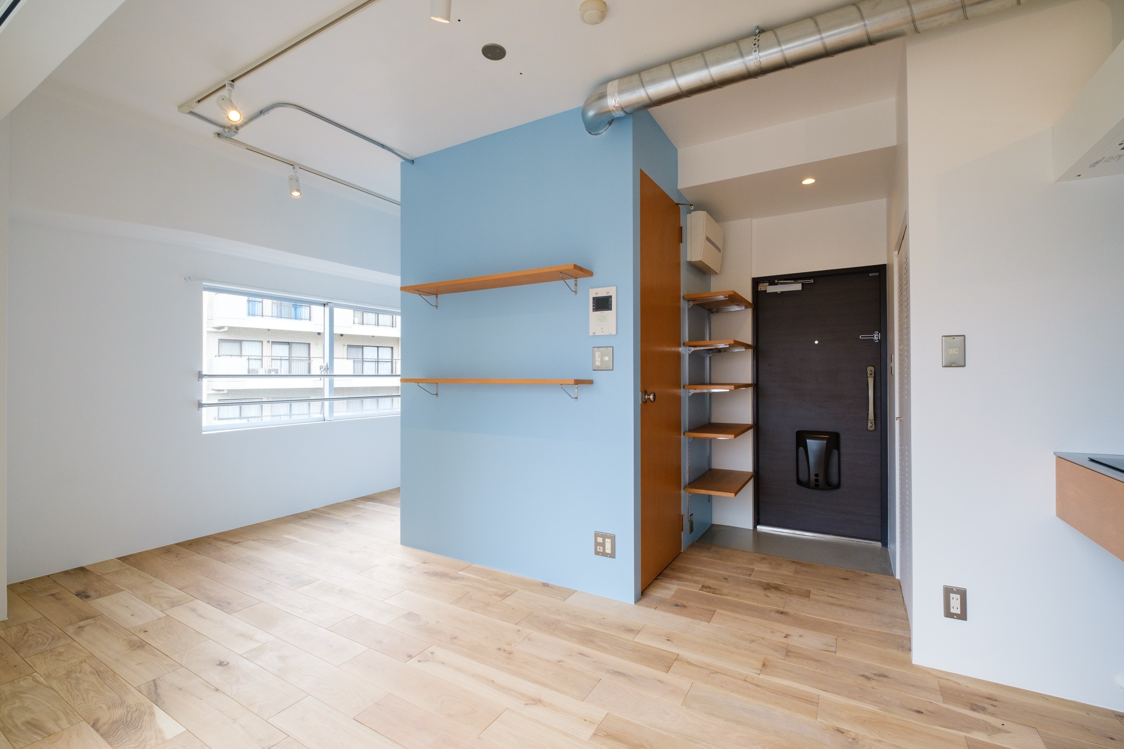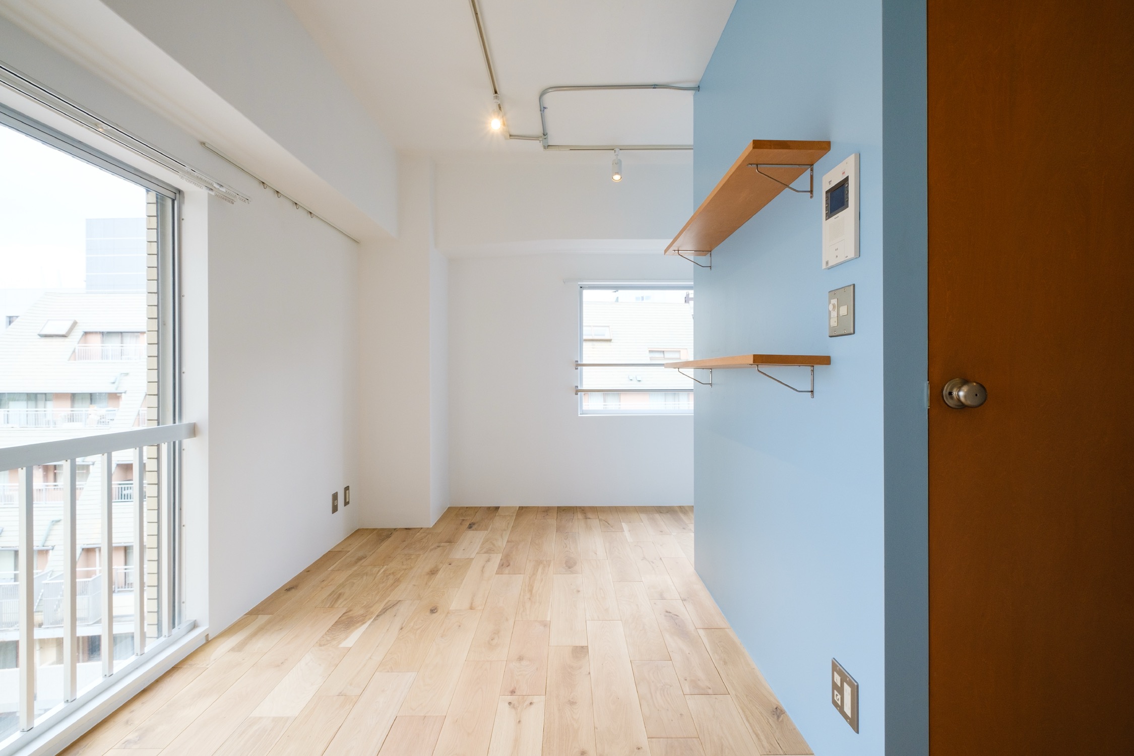 トレンドなショップや風情ある駅前の横丁、ガーデンプレイスや写真美術館などさまざまなカルチャーが行き交う「恵比寿」のまち。中目黒や代官山も歩いて散策でき、ハイセンスなスタイルにとことん触れられるエリアです。そんな「恵比寿」駅から徒歩わずか3分の場所にあるリノベーション賃貸「Plain」。10階の角部屋、2面採光という条件が揃い、街中にも関わらず開放感ある室内。コンパクトながらスペースを生かしたプランニングで、使い勝手も良しです。風通しの良い室内によく似合う爽やかなブルーのアクセントウォールと、ホワイトオイルで色味を抑えたオーク材の無垢床がナチュラルな印象。お気に入りのアイテムが引き立つ飾り棚や、居室の奥に配置されたオープンクローク、脱衣所の可動棚などシンプルな設えも魅力的です。やさしい北欧カラーに包まれながら、旬な東京暮らしを満喫してみては?
