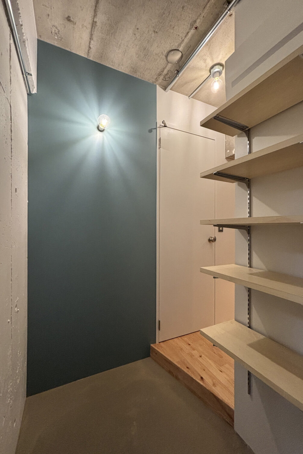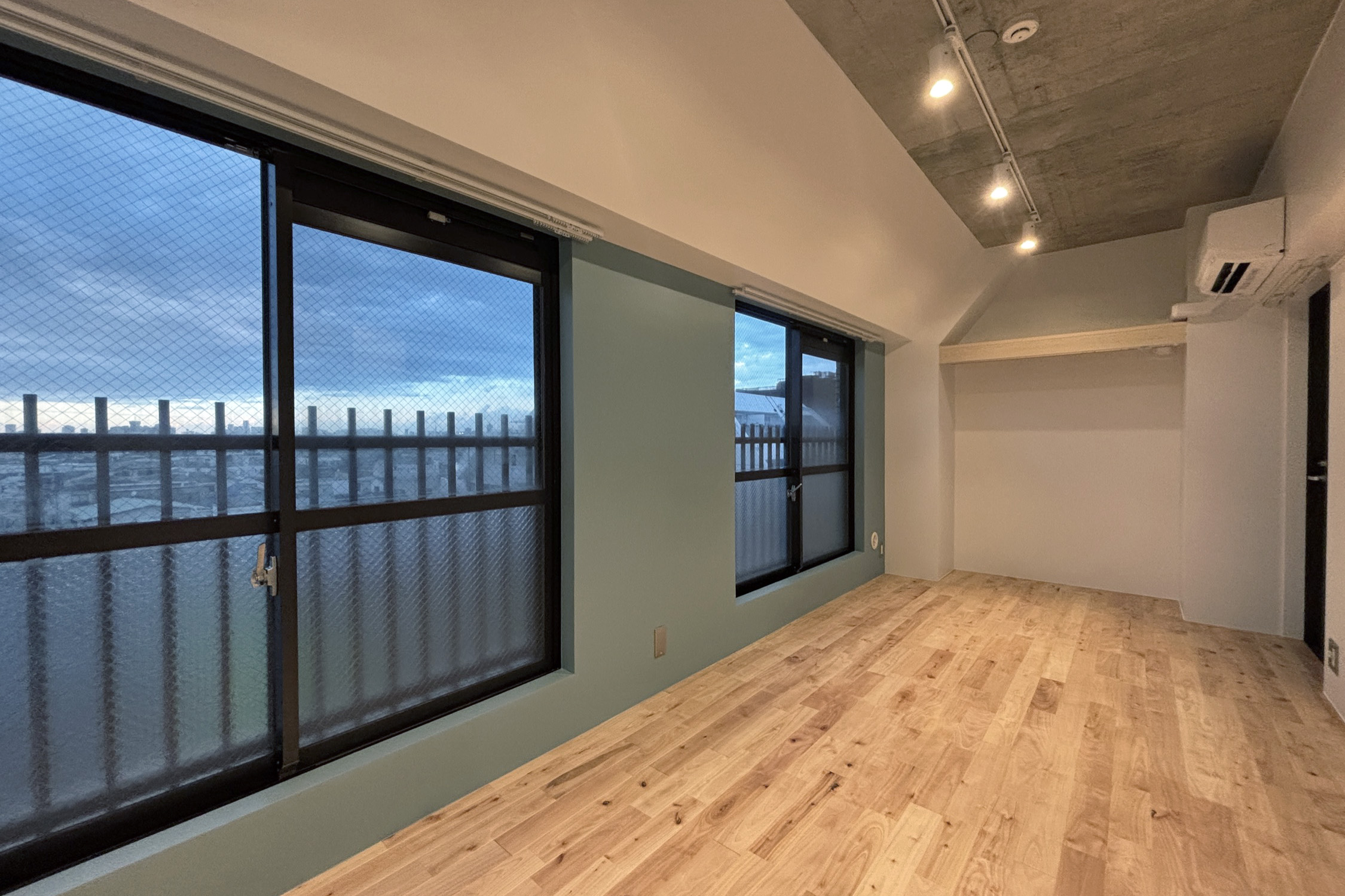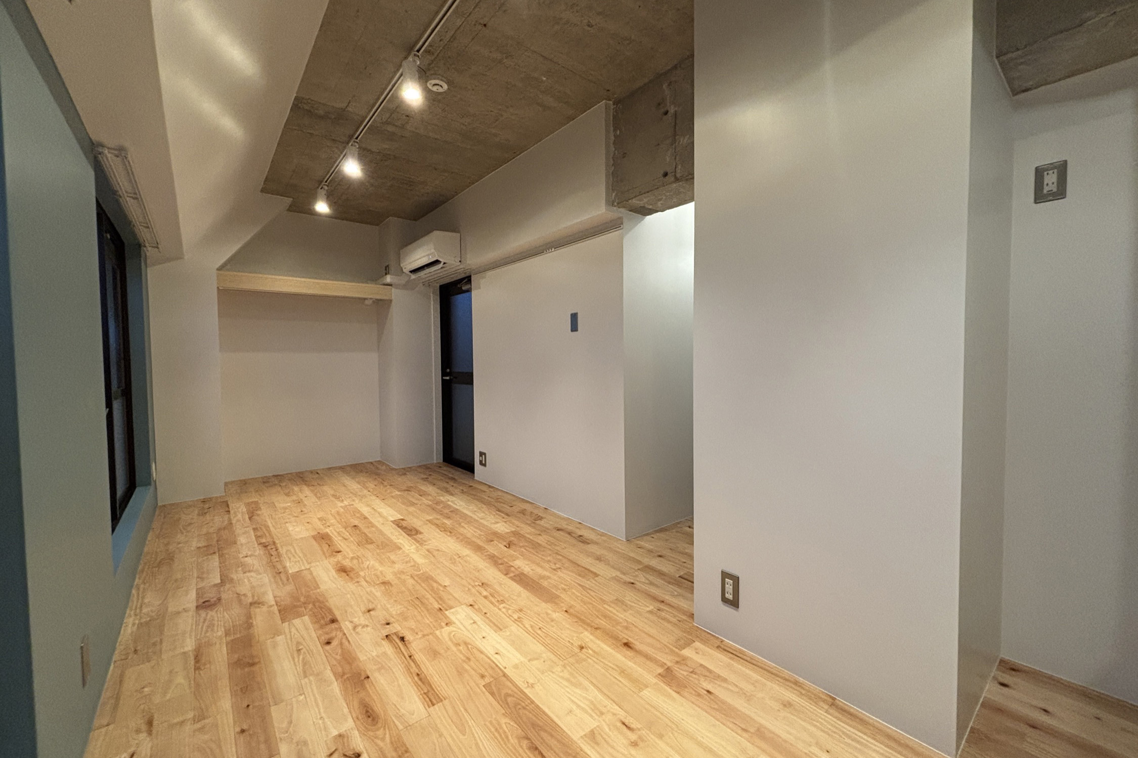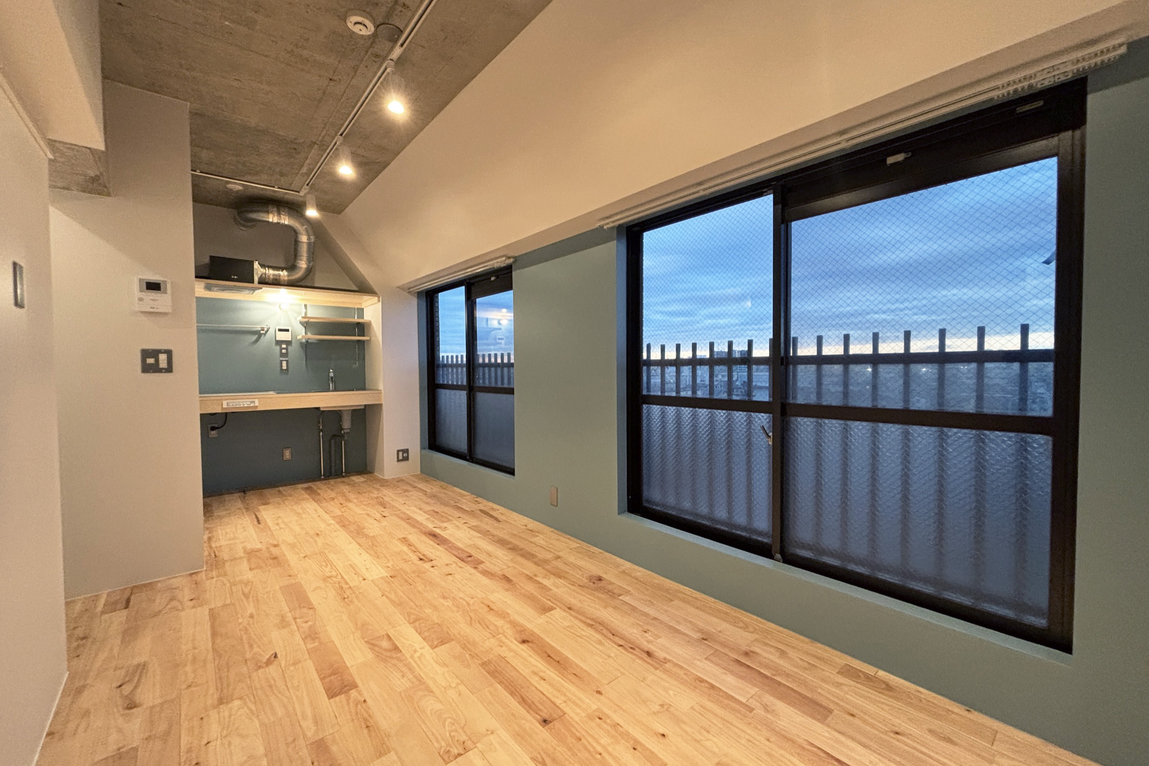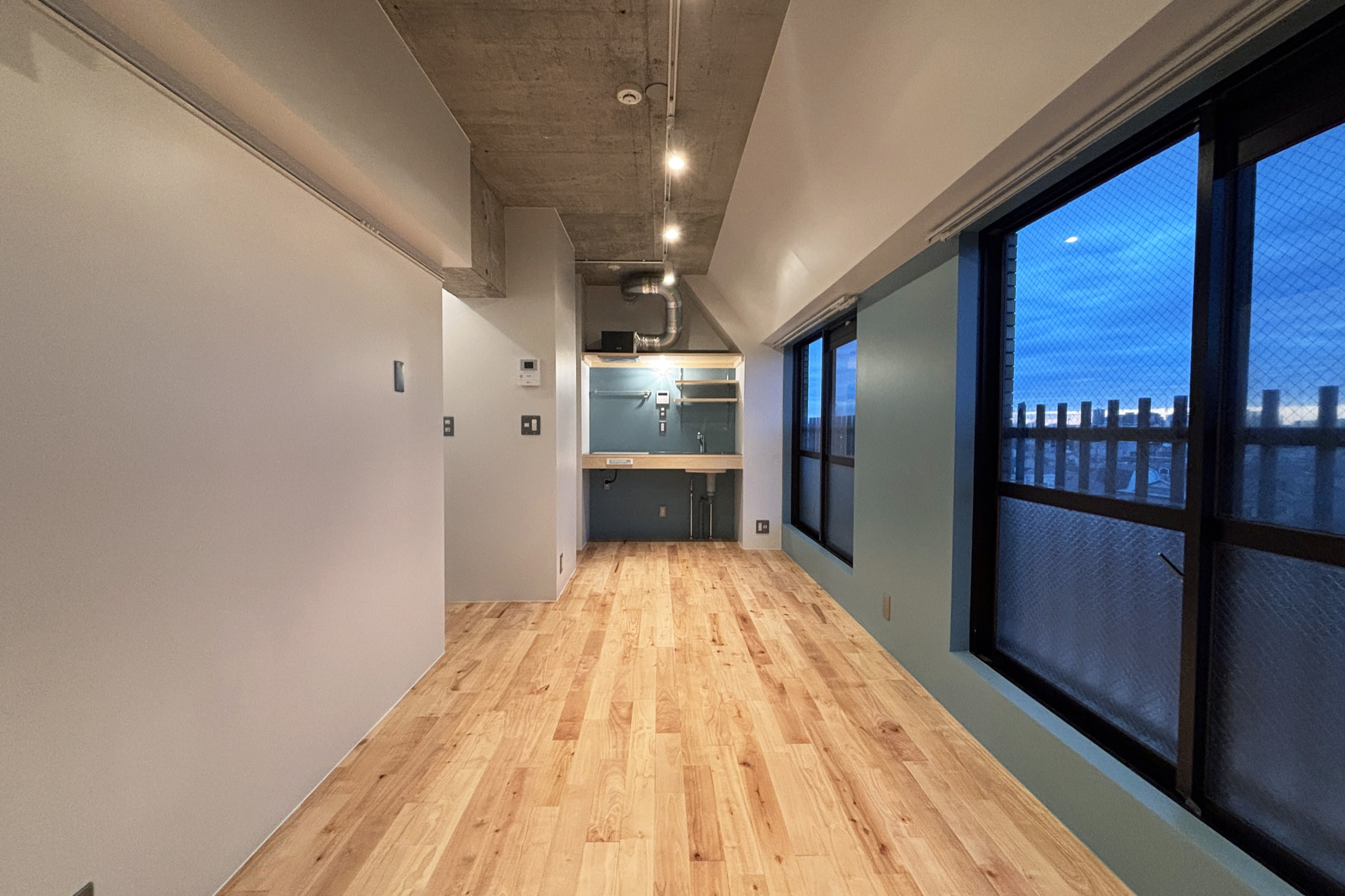 東急池上線の落ち着いた雰囲気が魅力の住宅街、蓮沼。昔ながらの商店や飲食店が点在し、気取らない日常を送りやすい環境が広がっています。蒲田も徒歩圏内にあり、利便性と穏やかな暮らしを無理なく両立できる街です。そんな場所に、アクセントカラーが特徴の「Plain」シリーズのお部屋があります。窓面と連動させたアクセントウォールが主役となる空間。エリアをイメージしたブルーは、洗練された印象の中に落ち着きを添え、お部屋全体の雰囲気をやさしく整えてくれます。玄関を入ってすぐに目に入る壁面や水回りの建具にも塗装を施し、空間全体に統一感を持たせました。水回りはシャワーブースを採用しコンパクトにまとめることで、居室スペースをできるだけ広く確保しています。横長の間取りを活かして、家具でゾーニングを行えば、リビングとベッドスペースの区分けもできそう。白い壁面にはプロジェクターで映画を投影したり、アートやグリーンを飾ったり。ピクチャーレールを活用すれば、気分に合わせたディスプレイも楽しめます。さらに、広々としたバルコニーもこのお部屋の魅力のひとつ。外の空気を感じながら、もうひとつの居場所として楽しめそうです。シンプルな中に、さりげない個性を。日常に心地よいアクセントを添えてくれる、そんな暮らしがここから始まります。