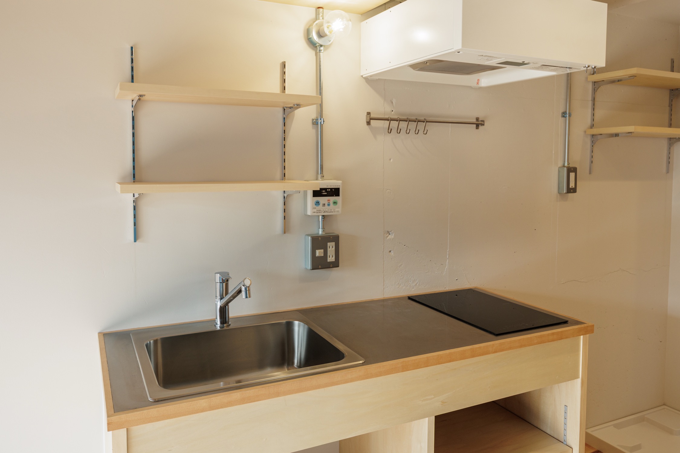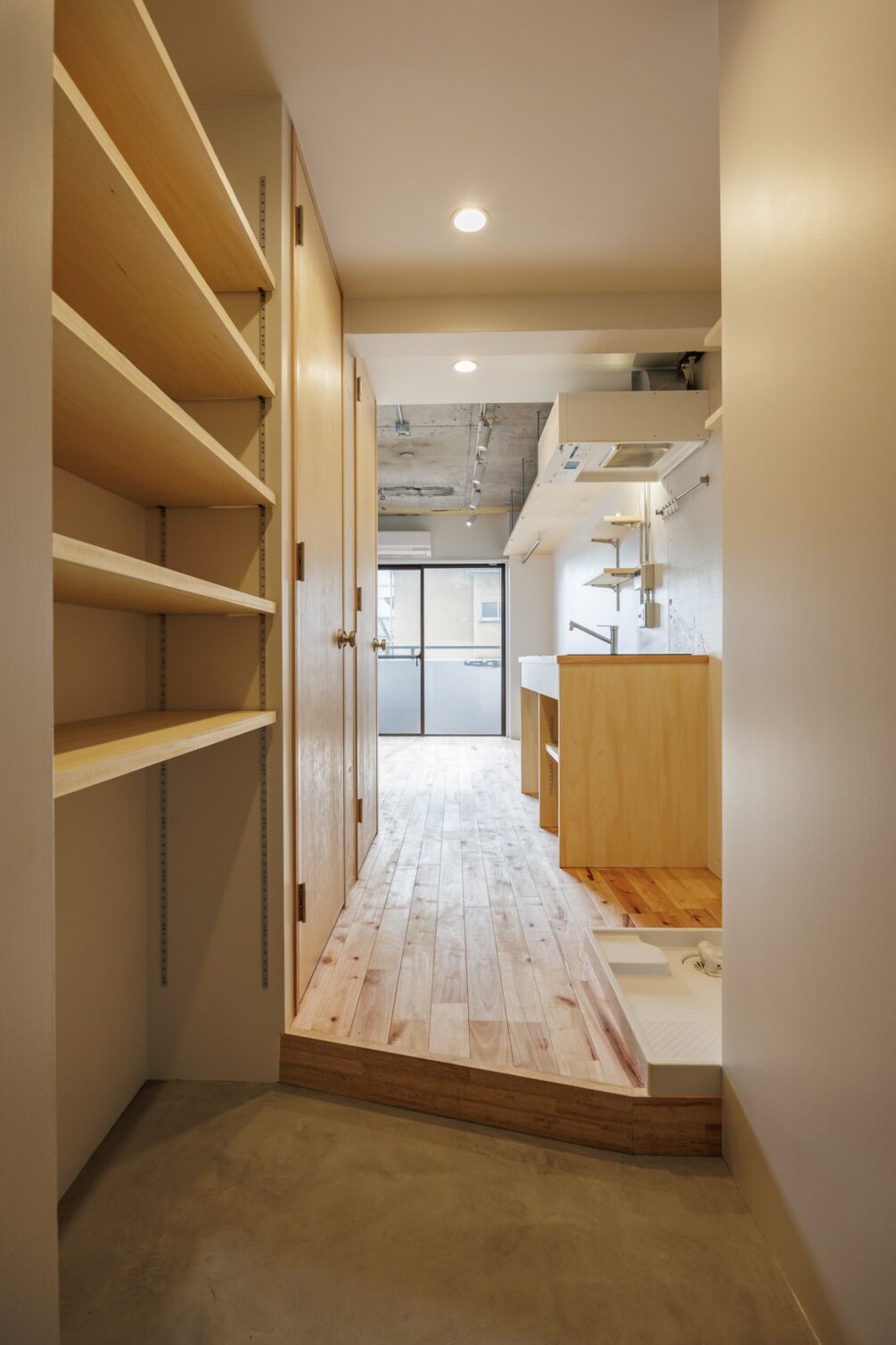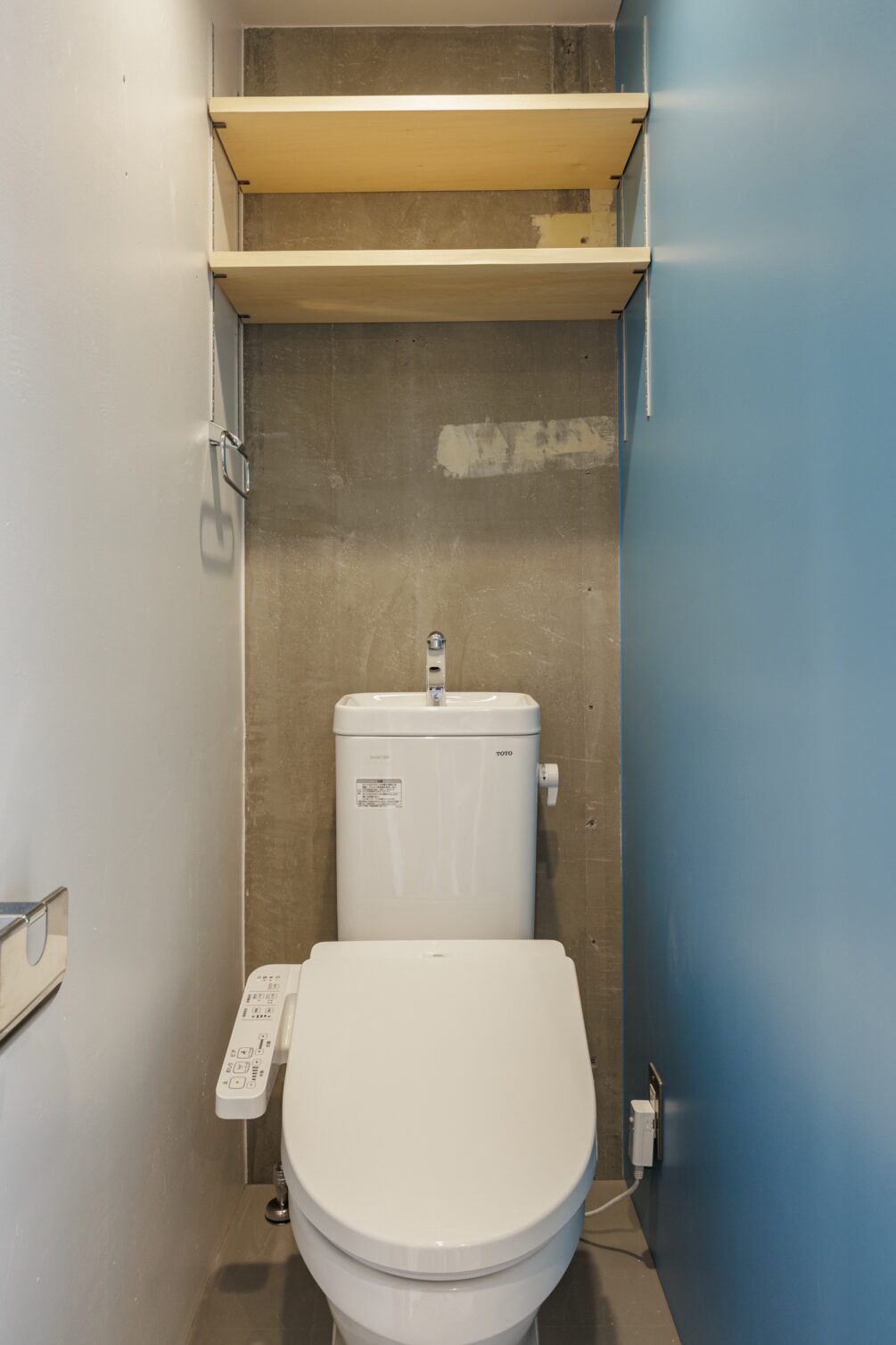 最寄りは西武新宿線の「野方」駅。新宿まで直通で行ける他、バス路線も豊富で、中野・練馬方面への移動も便利です。南北にある商店街は、昔ながらのお店も多く、日々の買い物も充実しています。そんな街に、リノベーションシリーズ「Plain」の部屋があります。南向きのバルコニーからたっぷりの日差しを浴びて、空の青とアクセントカラーの青をつながるような空間です。居室は一面に塗られたアクセントカラー、無垢床、白の塗装壁、天井の躯体、それぞれの表情や色合いがよく調和したお部屋に仕上がりました。圧迫感のないオープンクローゼットの上部に、壁一面の吊り棚を設置することで収納量も確保しています。構造壁を利用して、シャワーブースとトイレは分けていますが、それぞれの片面にもアクセントカラーを塗装することでデザインバランスをとっています。玄関を開けた瞬間、部屋の奥から光が差し込んできて、空を身近に感じるような、そんなお部屋です。