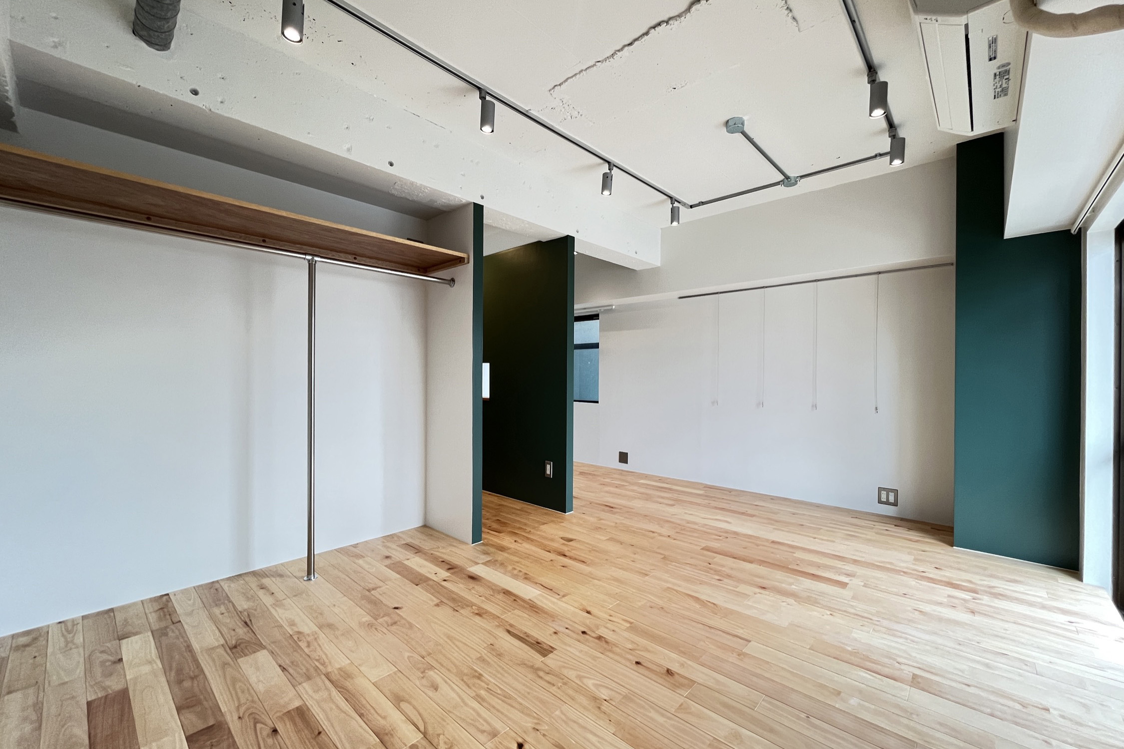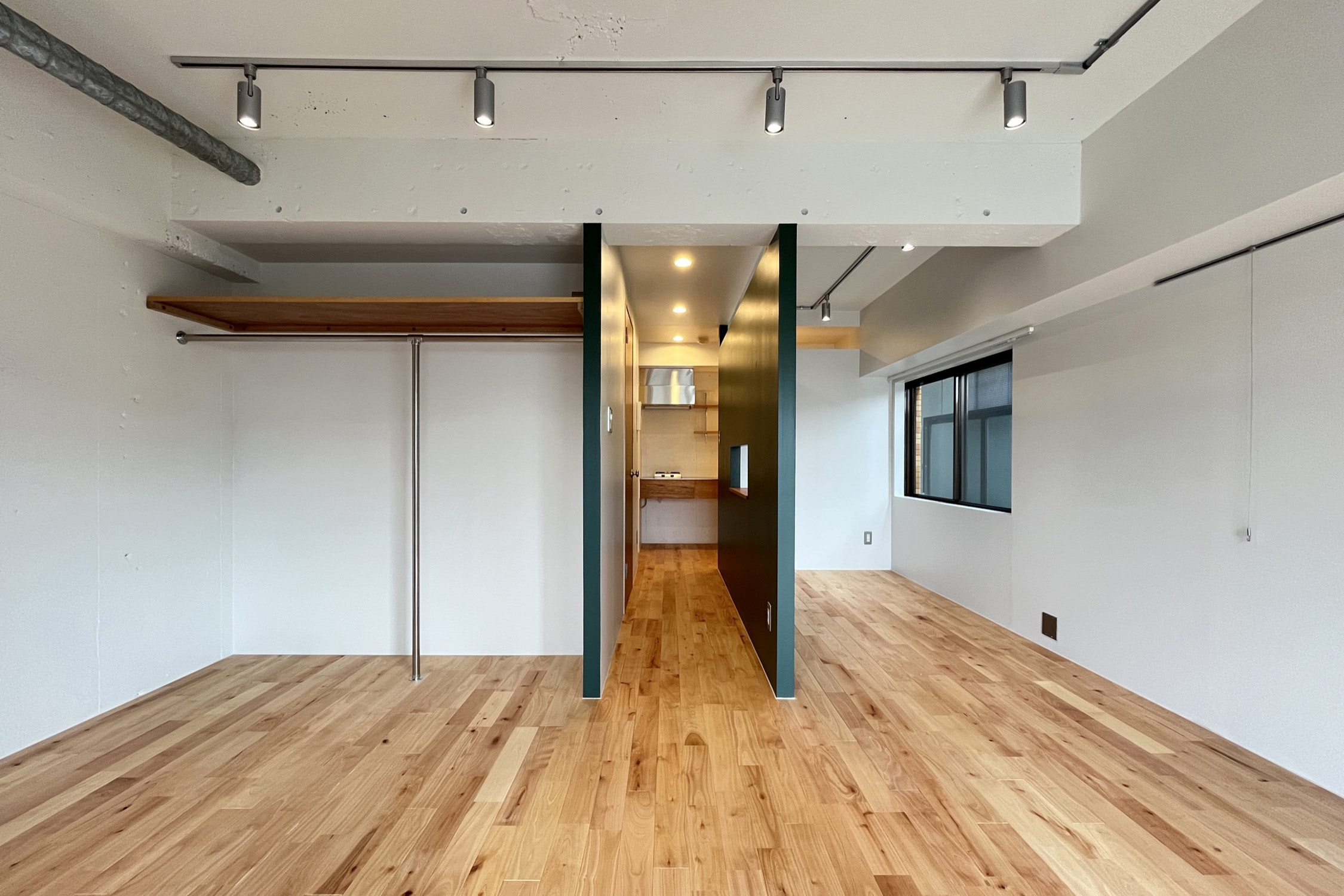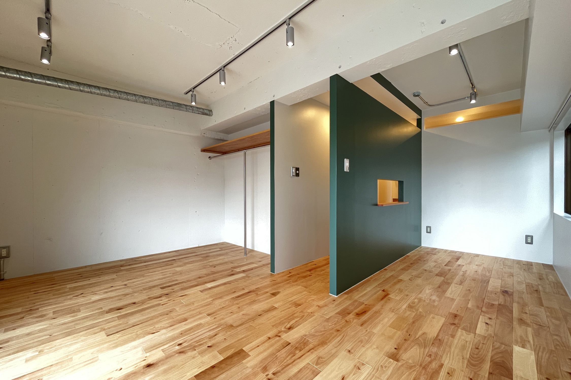 マンションは道路沿いにあるため、二重サッシを付け防音対策をさせていただいております!また二面採光になっておりますので、日当たり良好です♪ このお部屋のポイントは、お部屋の中央の造作壁!深みのある緑が落ち着いているものの、アクセントになっており、お洒落さが引き立ちます☆キッチンも広いため、料理好きの方にもおすすめです!