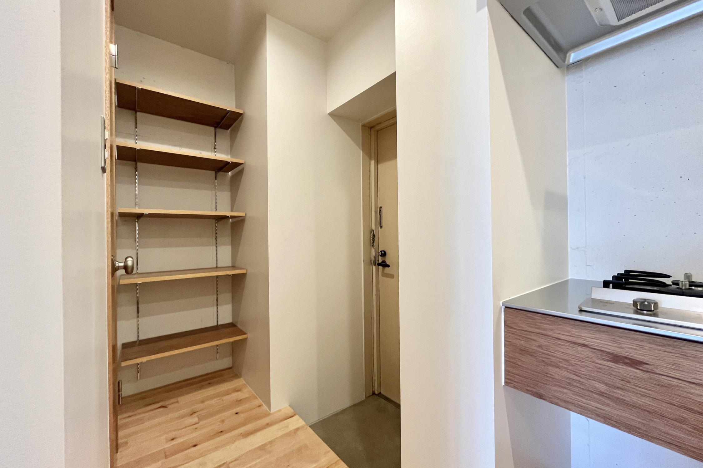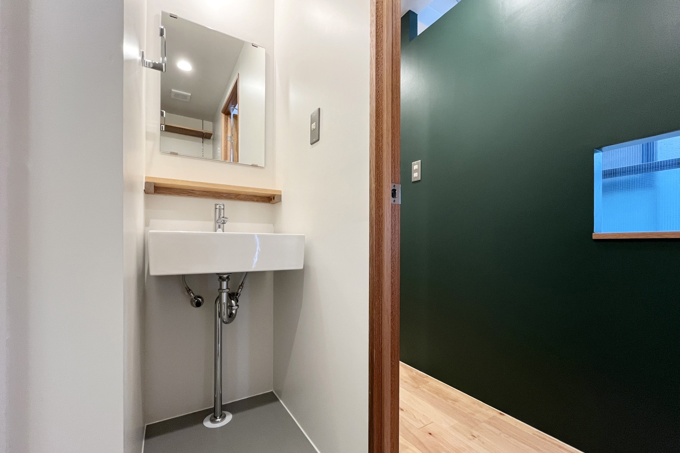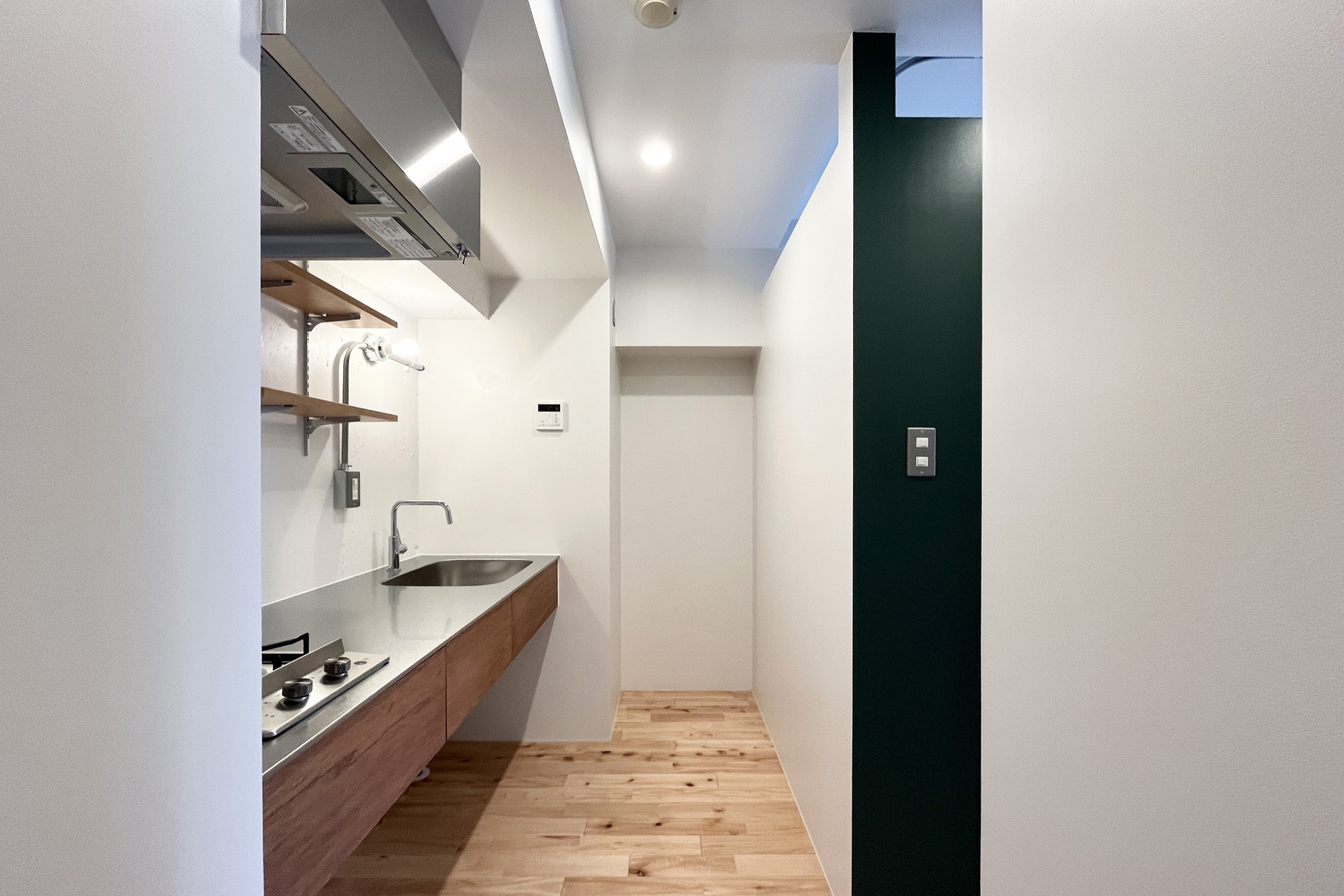 世界的な観光地として知られる「浅草」。銀座線、浅草線、東武スカイツリーライン、つくばエクスプレスが利用でき、都心へのアクセスに優れています。下町の人情と昭和の面影が色濃く残るこの街は、暮らすほどに愛着が深まるエリア。そんな街に、リノベーションシリーズ「Palin」の部屋があります。新緑の若草が香ってきそうなグリーンを纏った、浅草の街によく似合うお部屋に仕上がりました。廊下とキッチンが全体をT字に切るように走る間取り。水回りやキッチンは玄関側にまとめることで、部屋で過ごす暮らしを最大限に楽しめる空間です。ベッドスペースを隔てる造作壁の中央には、開口の小窓をあしらいます。閉塞感を和らげるだけでなく、お部屋のアクセントとなるようなデザインポイント。2面採光の居室は、明るい日差しを自然に取り込んで、柱や壁のやわらかなグリーンが印象的です。春の訪れを感じさせるようなあたたかな気分にさせてくれるこの部屋で、情緒ある街に暮らす、そんな生活が待っています。