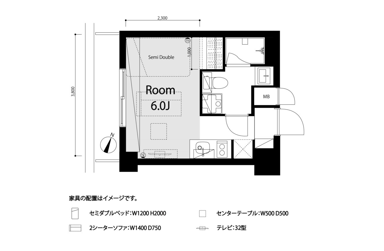 正方形に近いキレイな躯体のsozai空間は、水回りとクローゼットを効率よくまとめることでコンパクトながらも収納力たっぷり。横長が特徴的な居室は1Rながらもリビングと寝室をゾーニングしやすく、暮らしやすさにこだわった間取りです。