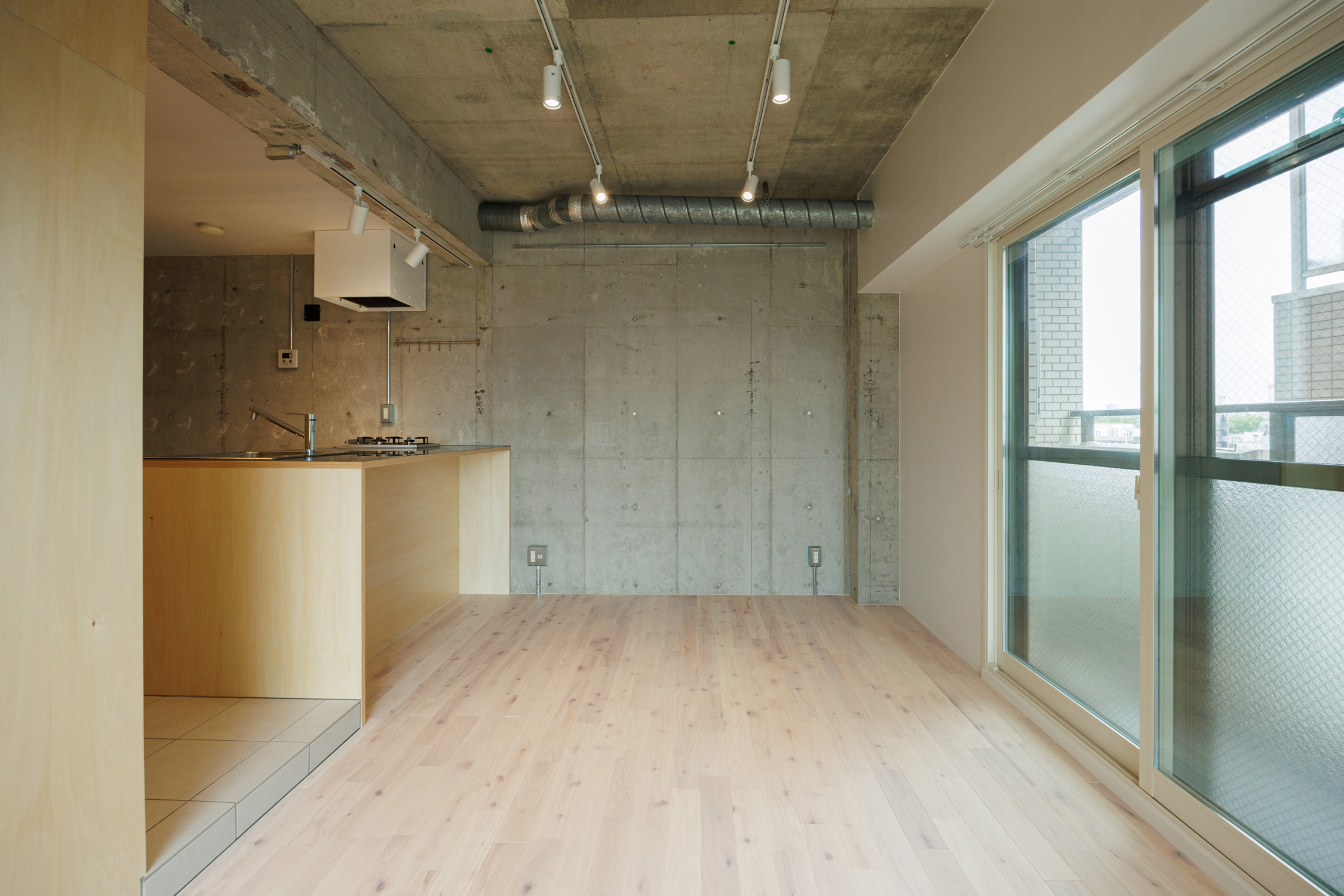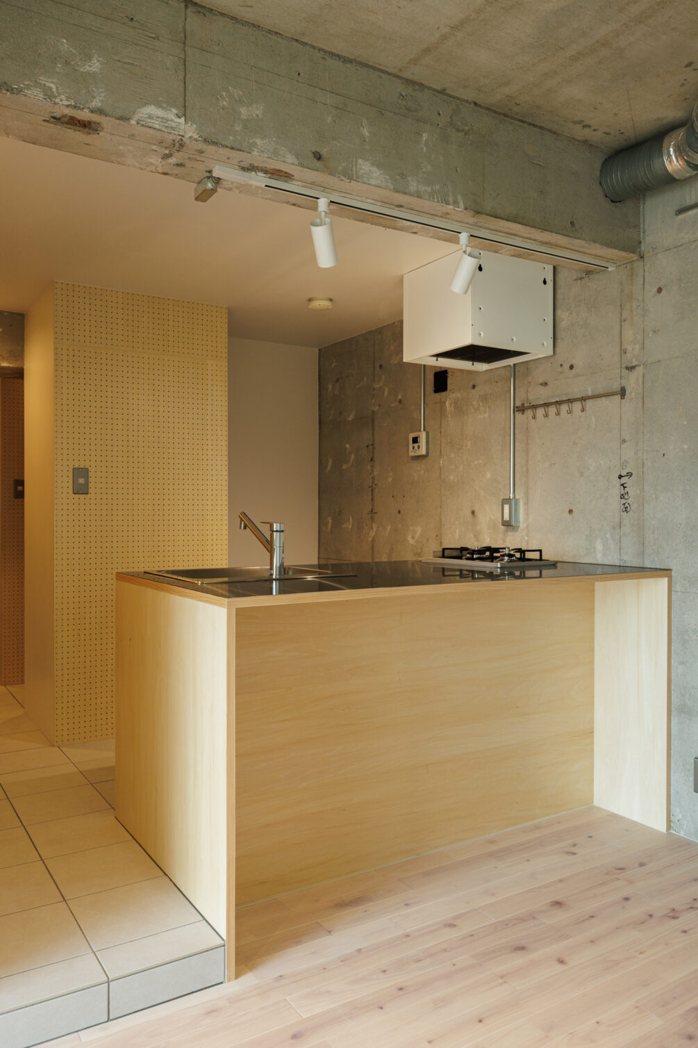 柔らかな日の入り方のお部屋だからこそ、sozaiシリーズのすっきりナチュラルなシナ材が似合うお部屋。造作のカウンターキッチンは居室側に少し伸ばすことで、ちょっとした作業をしたり、友達を呼んでお酒を飲んだりできるスペースとしても使えるようにしました。