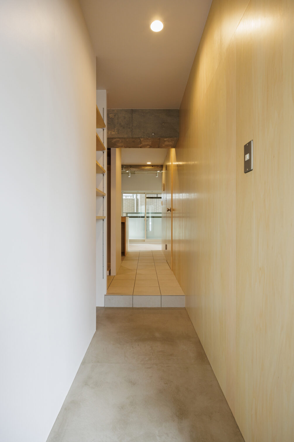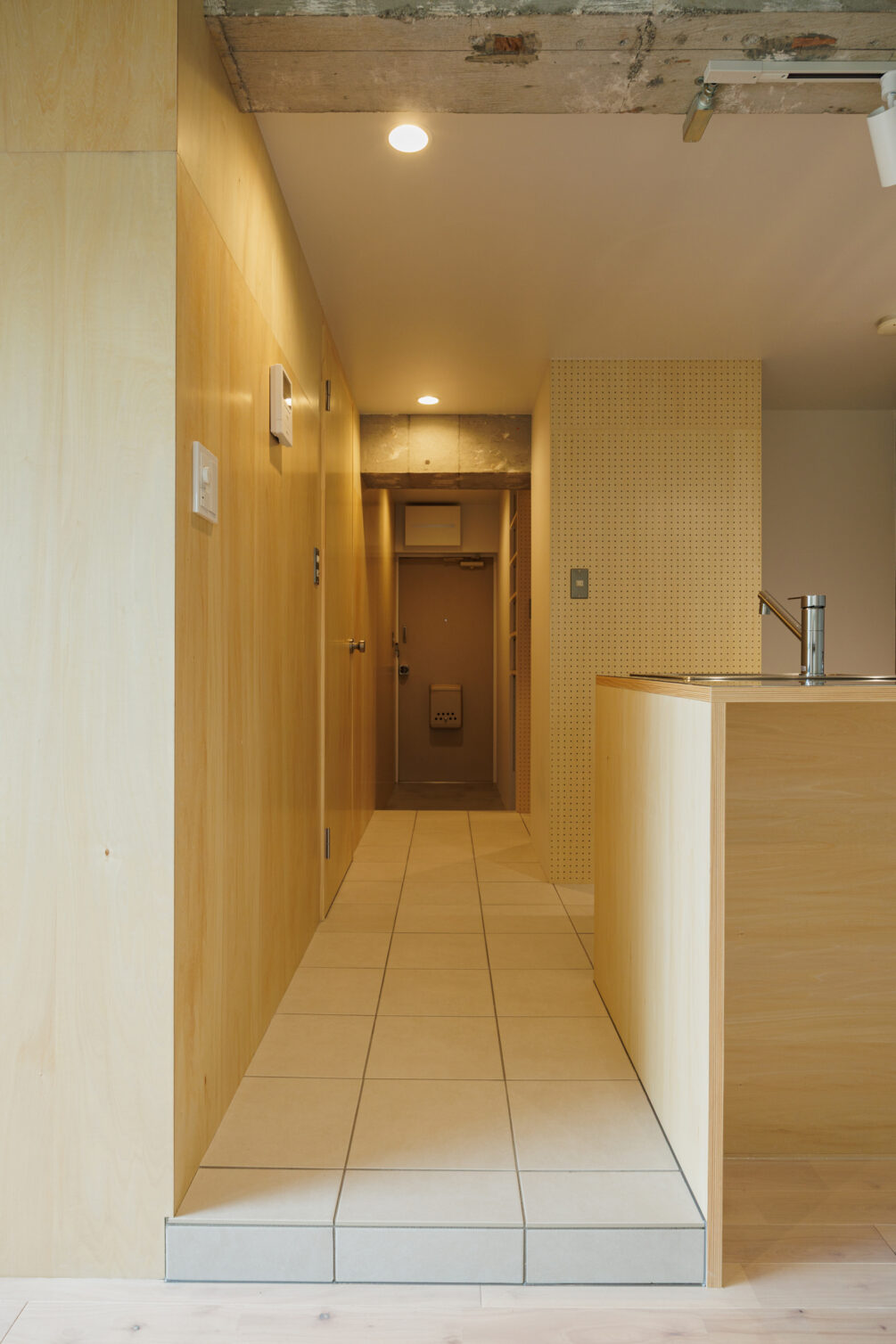 自然が多くのんびりとした雰囲気の街、町屋。地元に帰ってきたような安心感を感じる雰囲気はのんびりと下町ライフを送りたい方におすすめのエリア。そんな町屋に温かみあるシナ材がやわらかな雰囲気のsozaiシリーズがあります。玄関入ると右側にはシナ材の壁が伸び、お部屋に入った途端気持ちがリセットされるような気がします。クローゼットは玄関側にウォークインで設け、収納力抜群。洗濯機置き場を近くに設けて家事動線もバッチリ。キッチンはゆったりカウンタータイプで、自炊も捗りそう。カウンターは少し奥行を広げることで、ご飯を食べる+ちょっとした作業スペースとしても使えるように調整しました。洗練されたキッチンでお友達を招きたくなるようなプランニングです。ウォークインクローゼット内やキッチンの背面などお部屋の各所に有効ボードを仕込み、自分流のアレンジも楽しめる空間です。