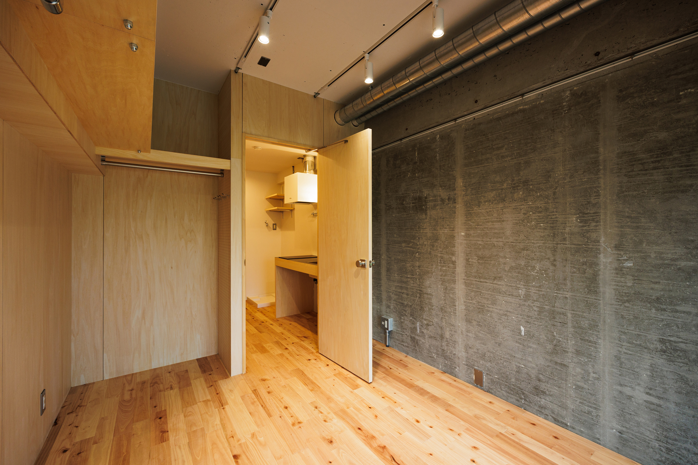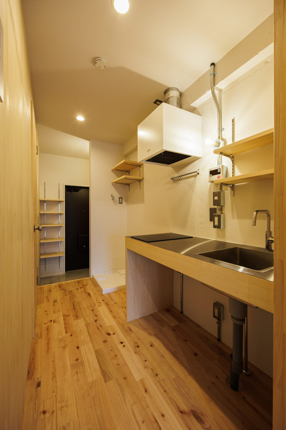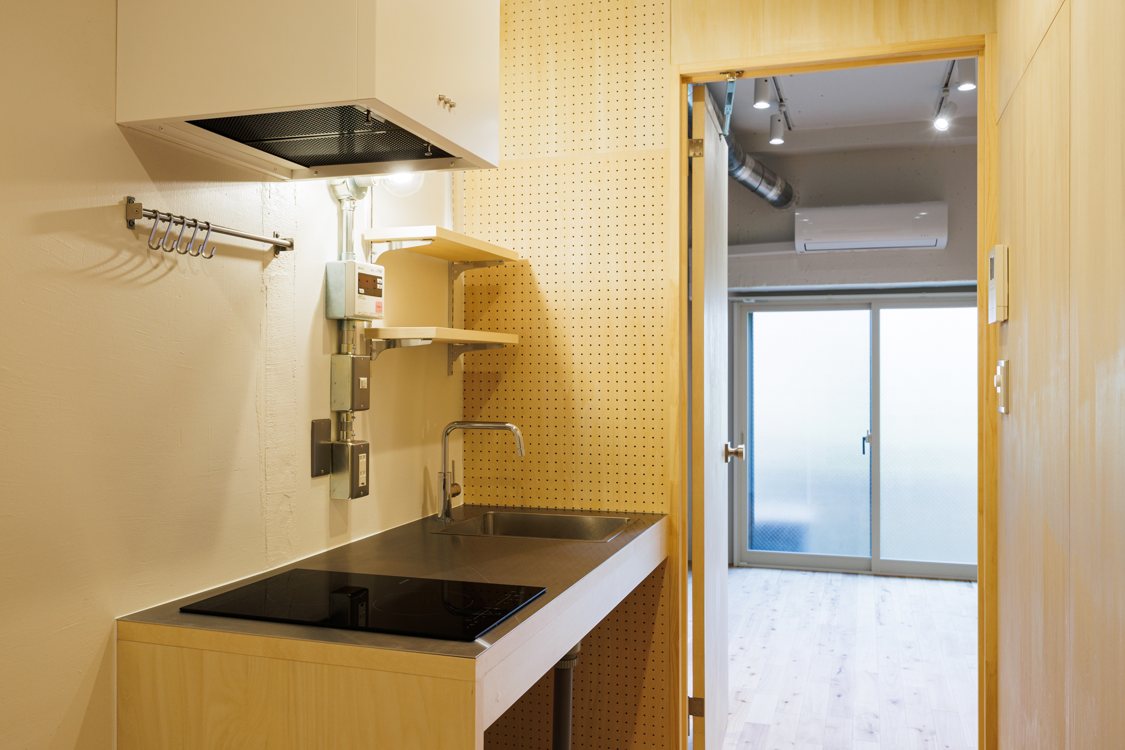 落ち着いた住宅街とおしゃれなカフェが共存し、渋谷・自由が丘にも好アクセス。暮らしやすさと程よい都会感が魅力の街、都立大学。学芸大学も徒歩圏内のエリアに素材にこだわりとことん心地よさを追求したsozaiシリーズがあります。玄関入ってすぐ、しなやかなシナ材が居室奥に伸びています。一面に有効ボードを貼り付け、鍵やよく使うものをひっかけたり、ディスプレイとしても活用可能。キッチン横に設けられた有効ボードはキッチンツールをひっかけたりレシピを吊るしたりするのもおすすめです。大通りに面している居室のため玄関と居室を仕切る扉をつけて暮らしやすさも意識しました。居室は壁面と吊り棚に贅沢にシナ材を活用しすっきり洗練されたお部屋に。反対面は綺麗な躯体が出てきたのでそのまま活かしました。ピクチャーレールを梁下にピッタリと取り付け、アートポスターやグリーンなどをハンギングすることも可能です。無垢材に包まれた癒しの暮らしを送ってみませんか。