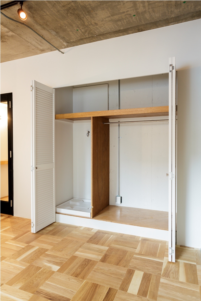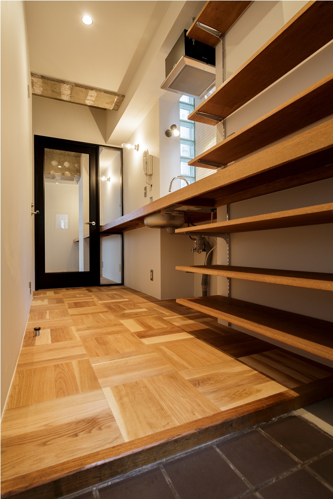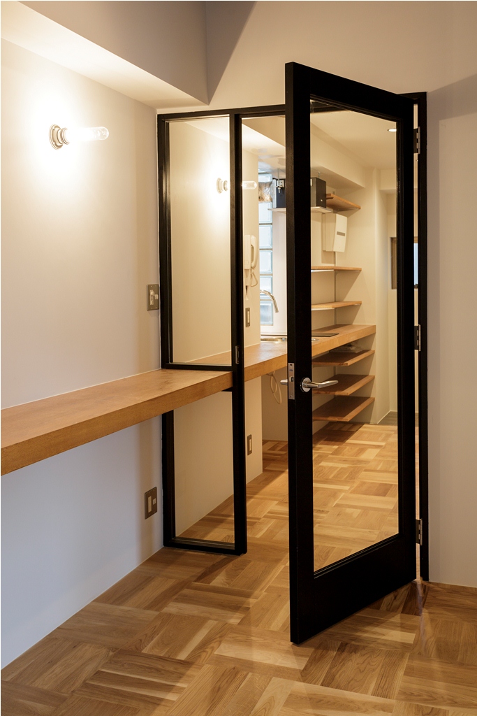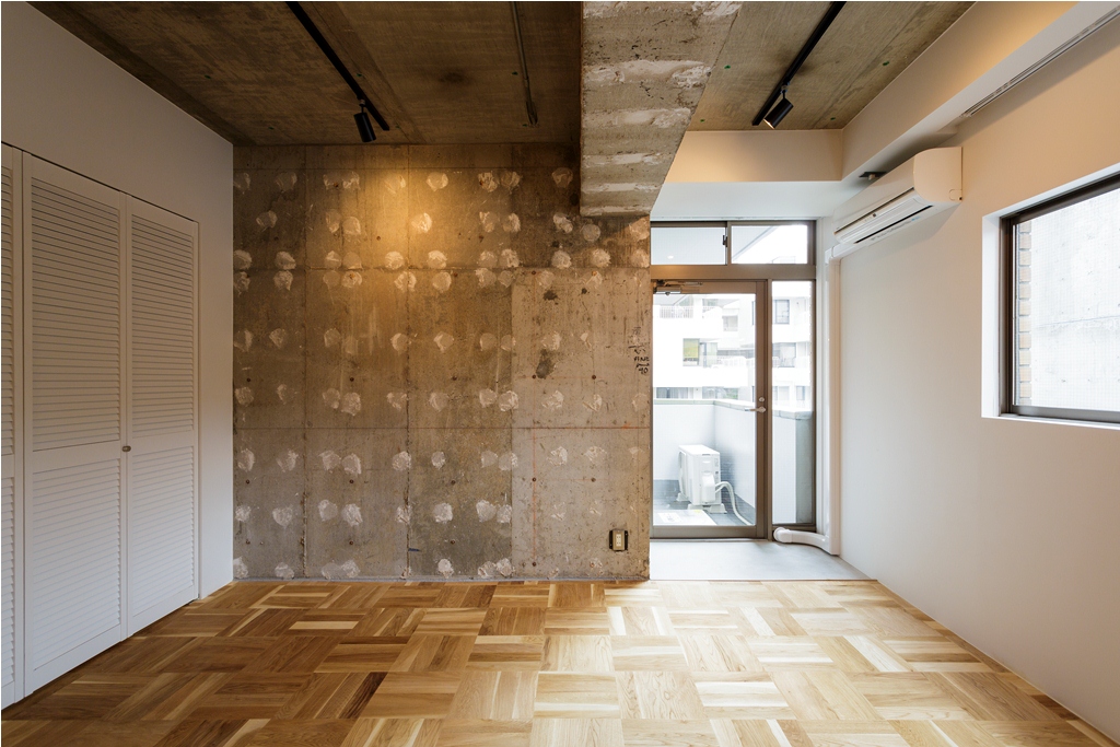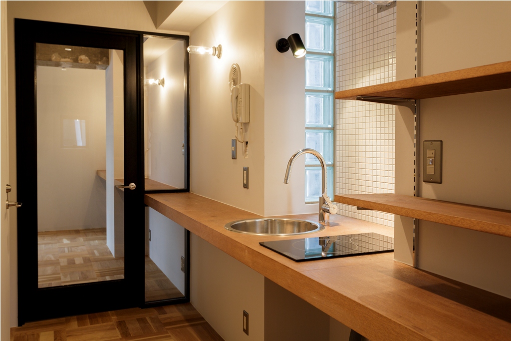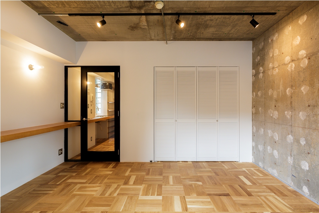 渋谷六本木通りから少し入った、周辺にはオシャレなカフェや飲食店が集まるエリアにあるリノベーションシリーズ「Union」。タイルに囲まれたキッチンから部屋の奥までカウンター棚がつづき、壁に付けられたブラケットライトがまるで誘導灯のように導いてくれます。居室に入ると、幾何学模様のようなパーケットフロアと真っ白なルーバー扉がモダンな印象で訪れる人を迎え入れます。