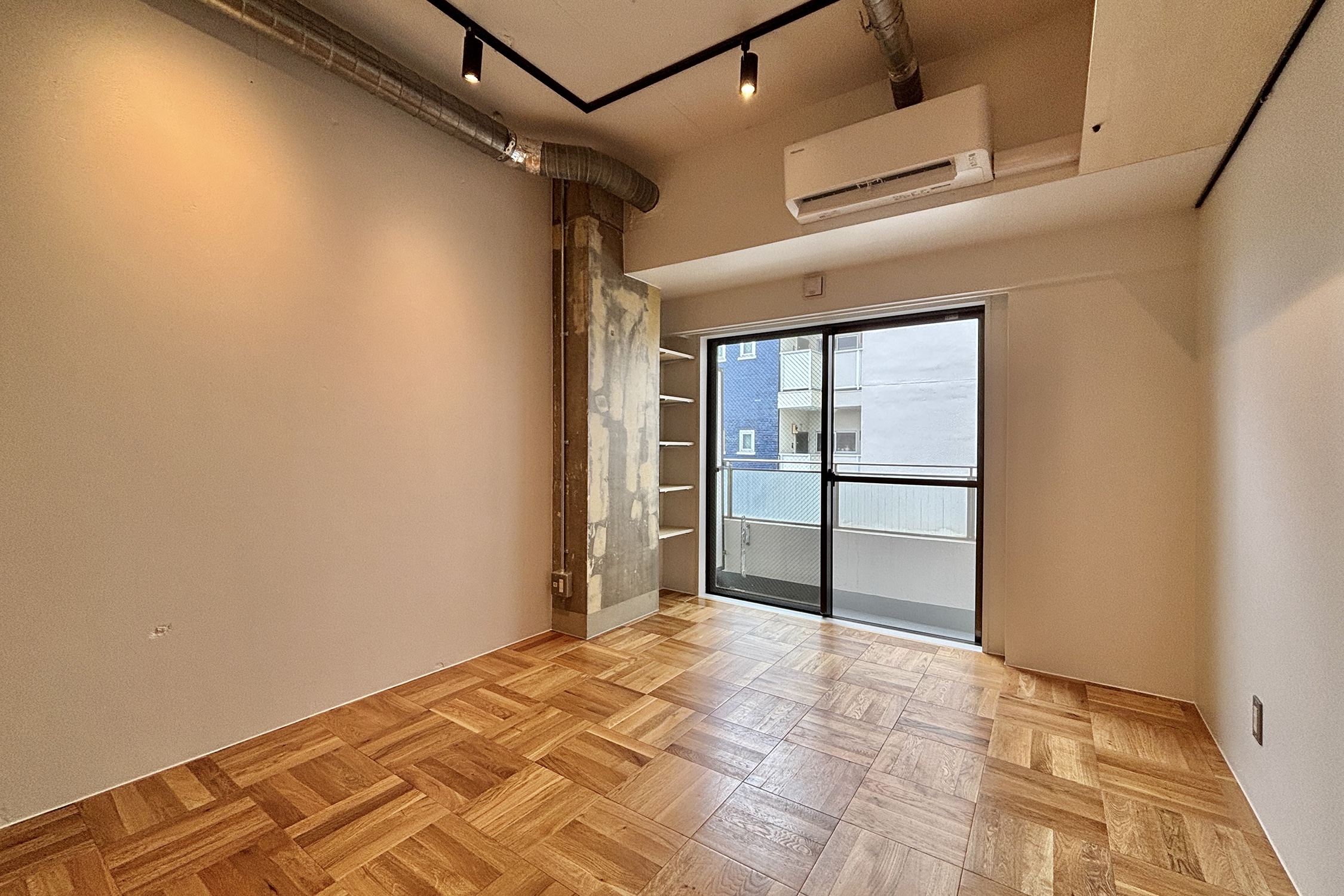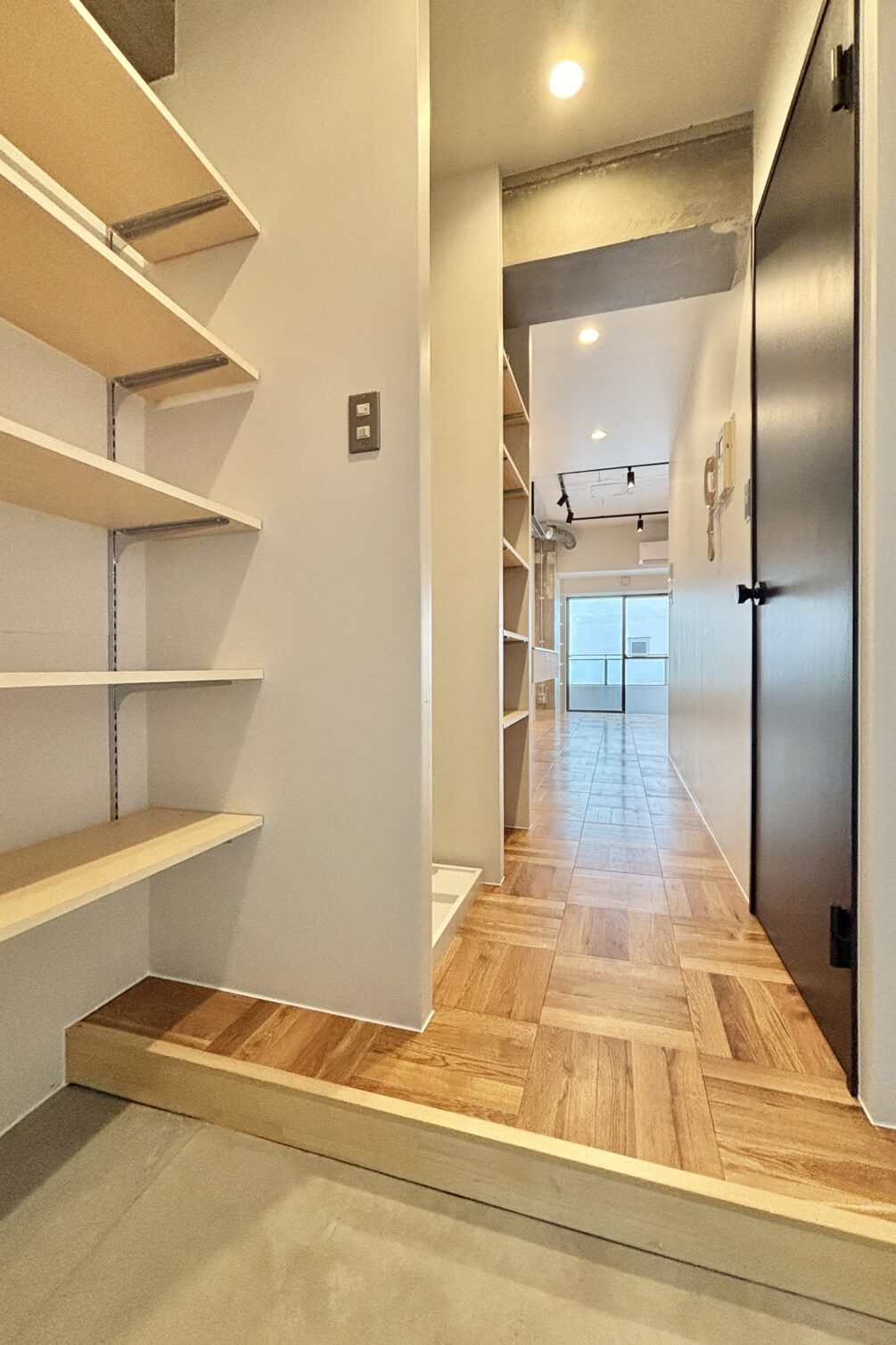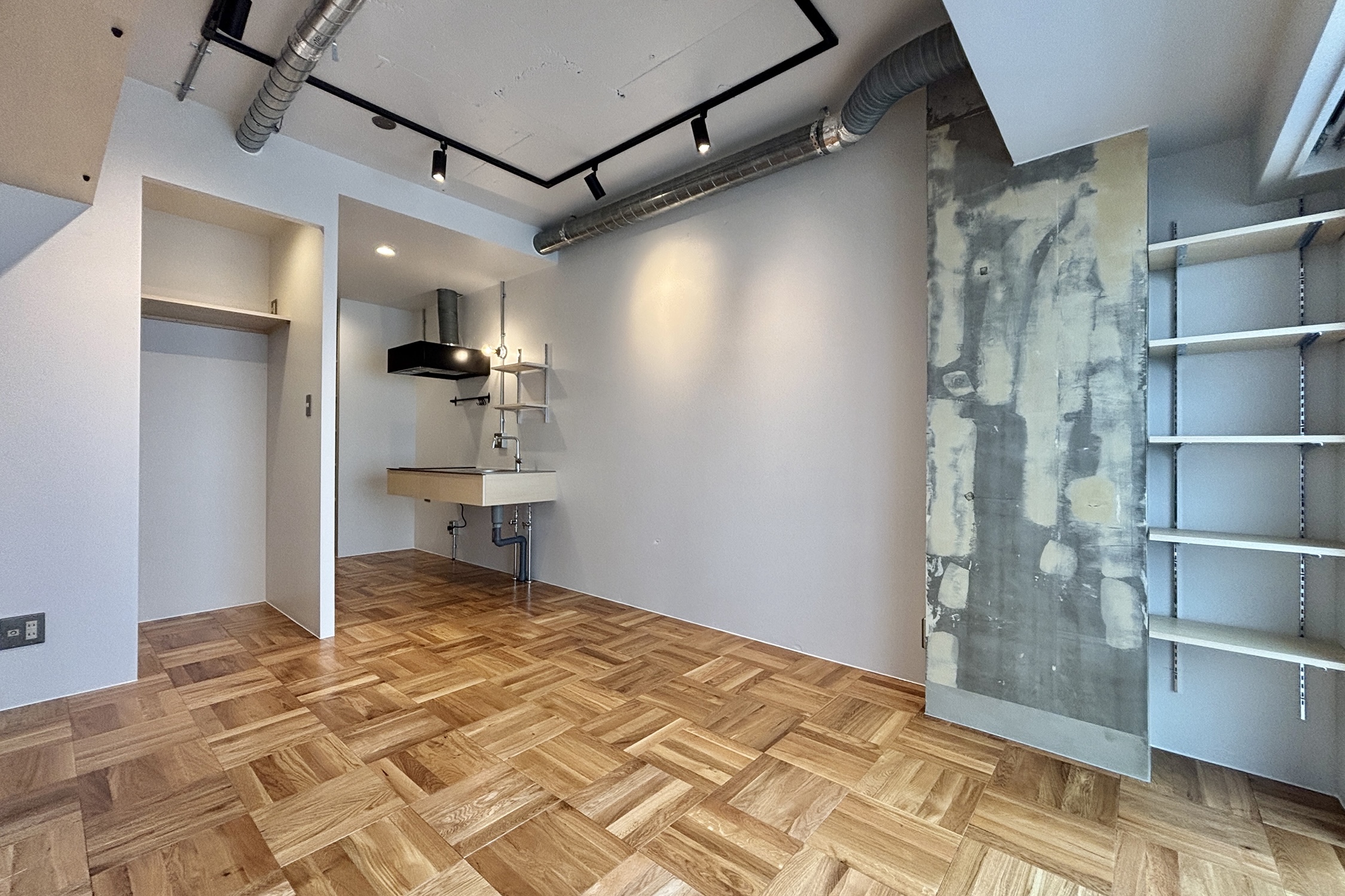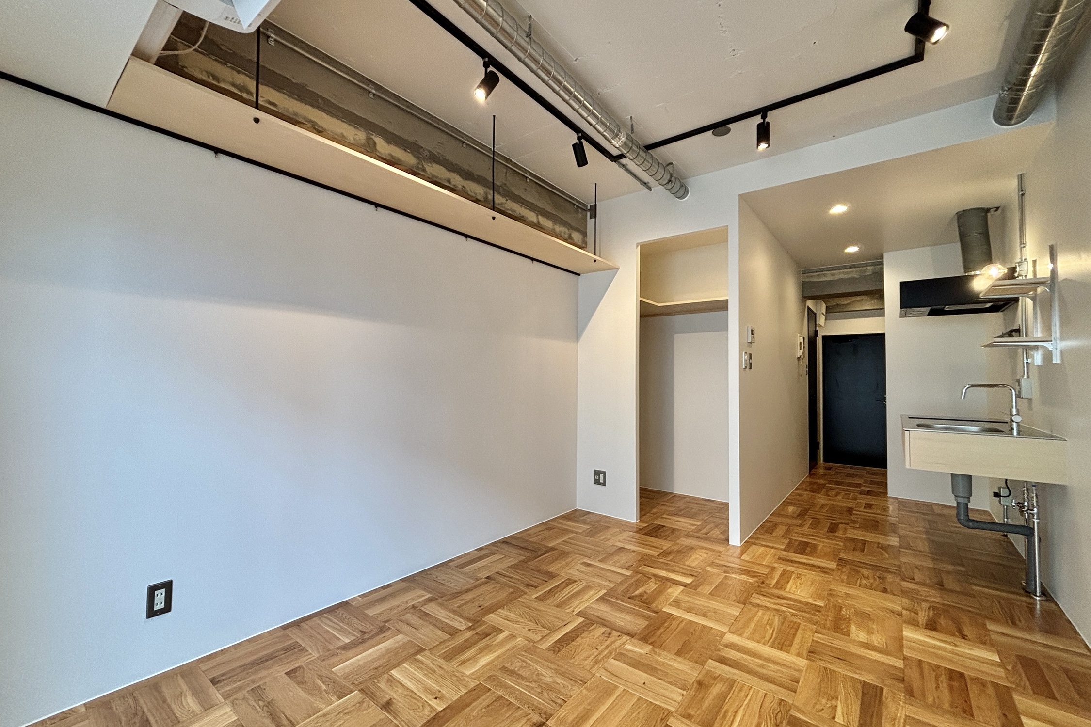 東急目黒線で「目黒」駅から2つ隣のまち「武蔵小山」。東京一のアーケード商店街は日用品が一通り揃う便利さ。駅前の再開発で様相が変わっても、どこか人懐っこさが残る武蔵小山の街。そんな場所に、リノベーションシリーズ「Union」の部屋があります。時代に左右されない、上質な空間に仕上がりました。玄関から窓に向かって組み木で作られたパーケットフローリングが伸びていきます。水回りの扉はブラックで仕上げて、廊下からモダンな風合いが感じられます。キッチン横の廊下部分に、柱に合わせた可動棚を設置。毎日の料理も楽しくなりそうです。居室に入ると、南向きの日当たりの良い窓から入る日差しが、無垢材の表情をキレイに映し出しています。手持ちのインテリアも、ここに来たらこれまで以上に愛着が湧いてきそうです。ウォークインクローゼットとワイドのある吊り棚で収納力もしっかりと確保しているのもポイント。変わっていく街を楽しみながら、変わらないものを見つけたり、そんな喜びに満ちた暮らしが送れる予感がします。