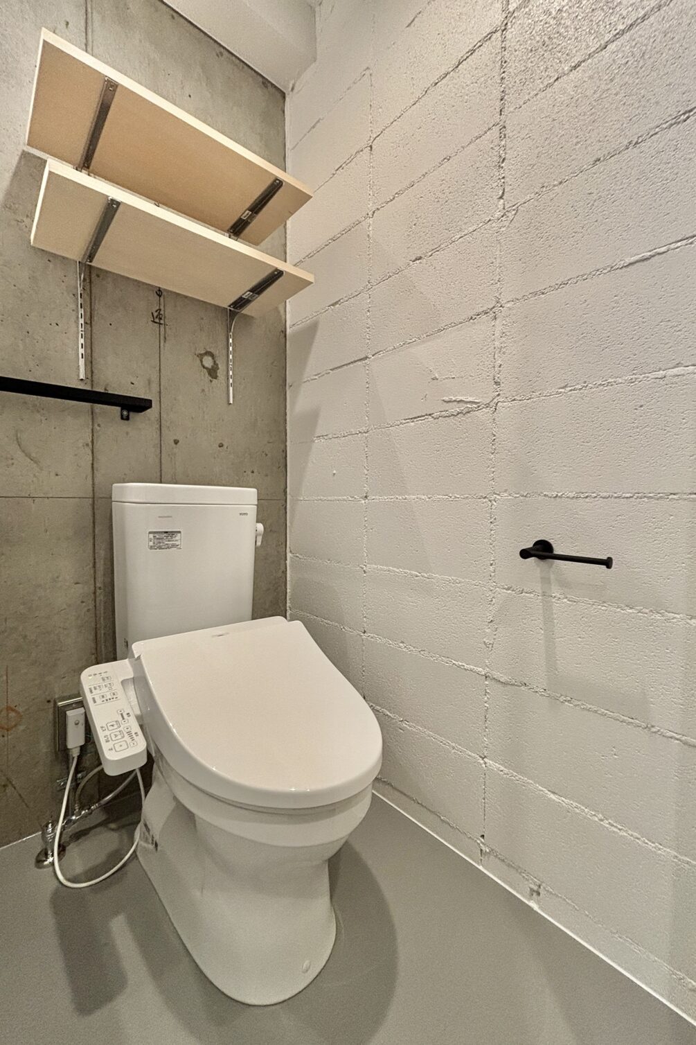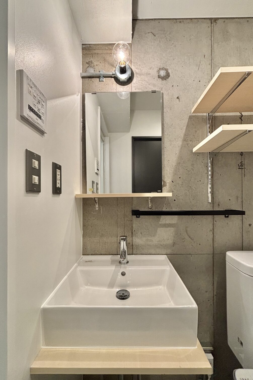 長方形の間取りに2本の柱が突き出した形の間取り。柱を生かして可動式の収納棚を設置します。水回りとキッチンをコンパクトに廊下側にまとめることで、できたスペースにウォークインクローゼットを用意しました。機能性をしっかりと担保しつつモダンな空間を演出していきます。