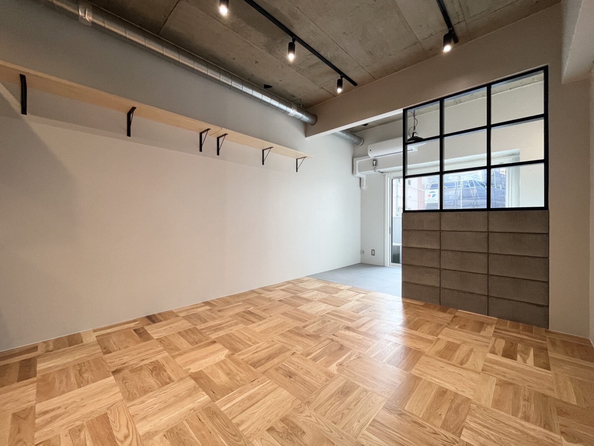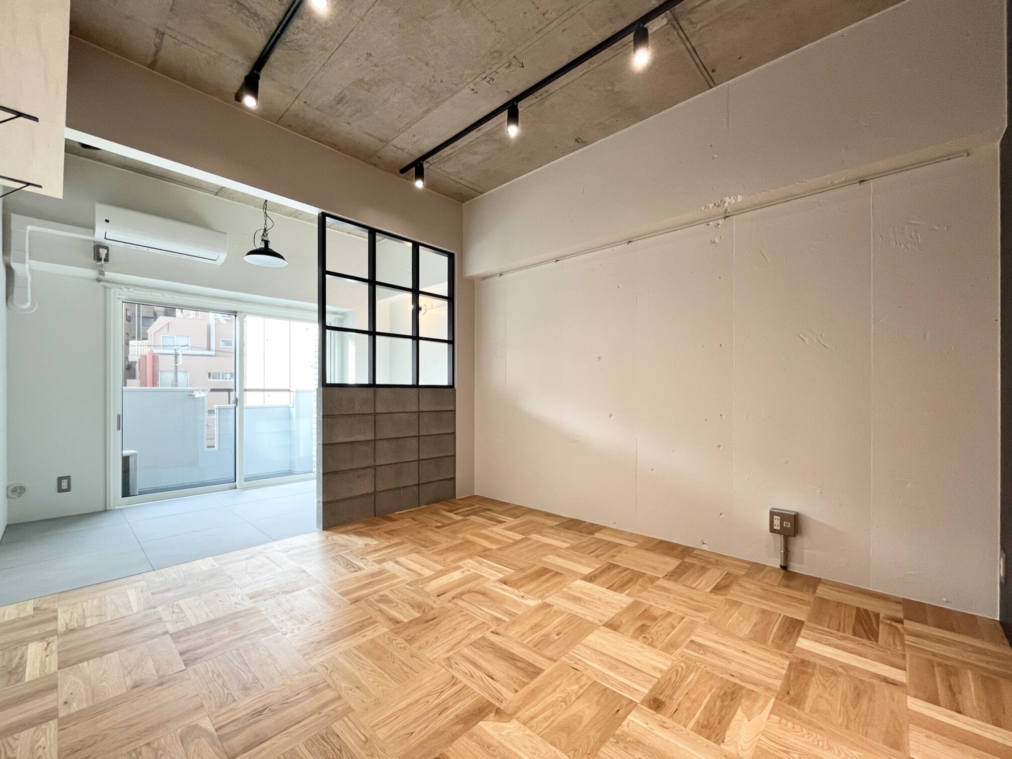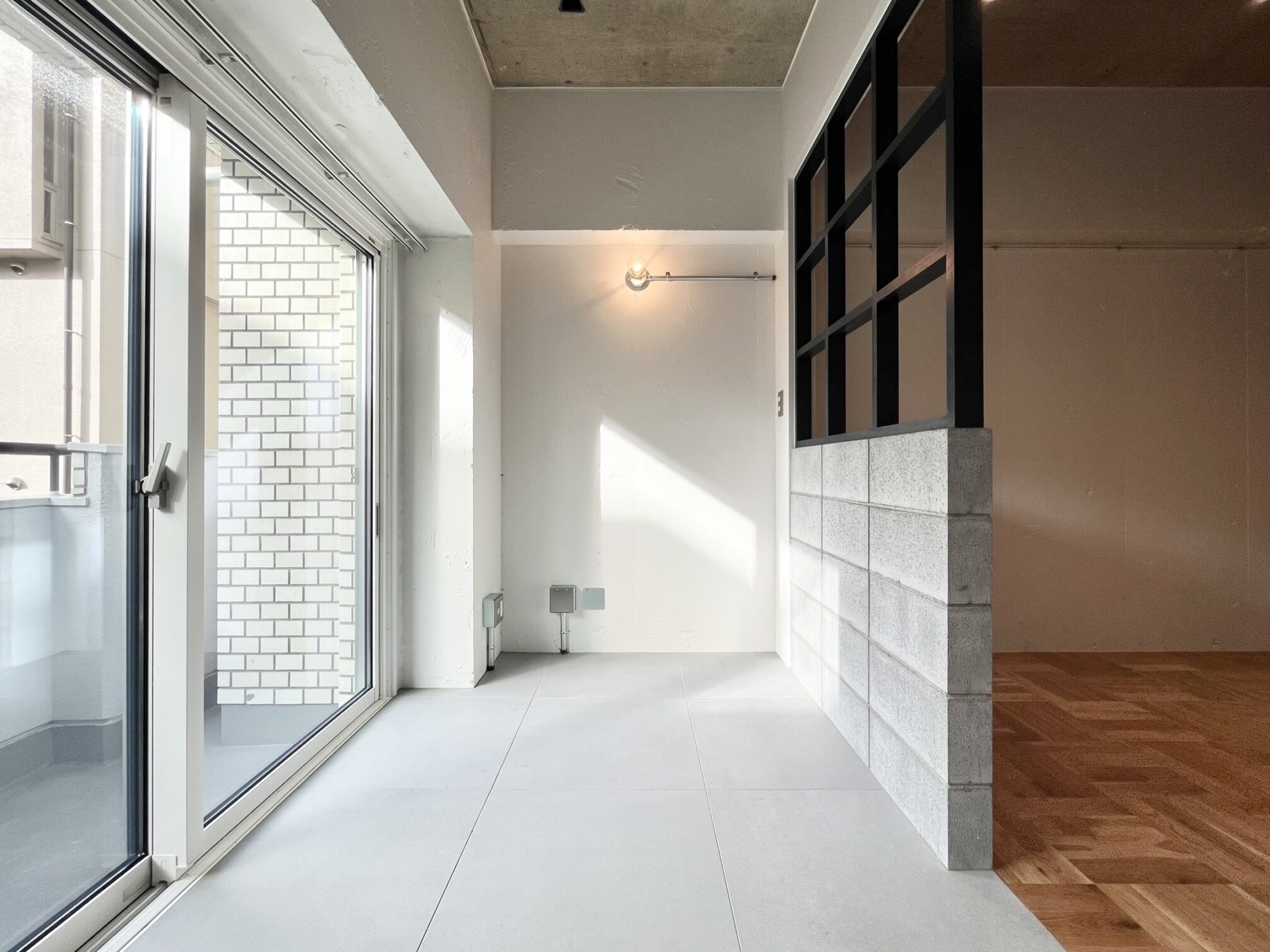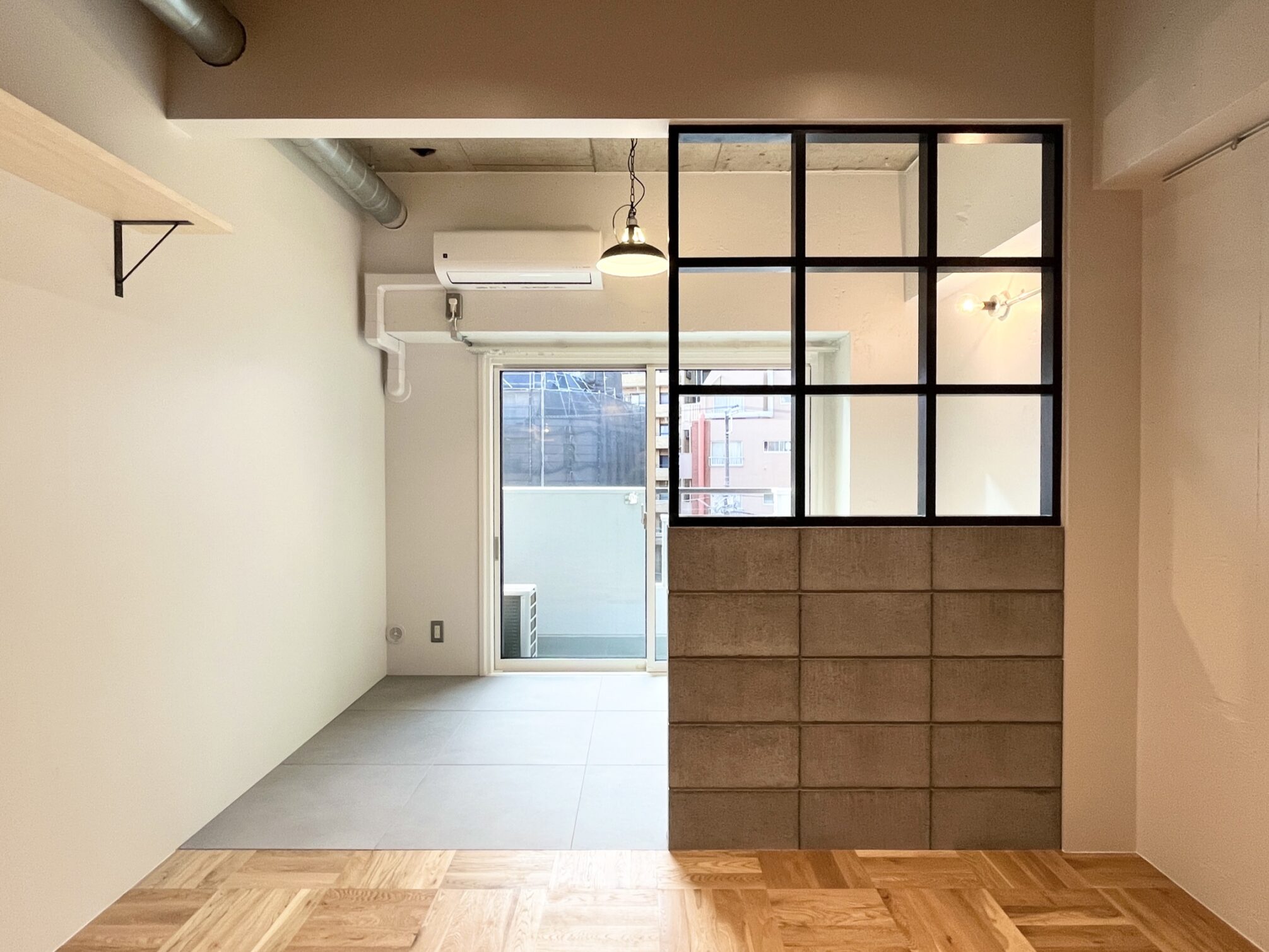人通りが多く、下町風情のある賑やかな「新板橋」駅。公園など自然も多いが商店街も多数存在しているため、買い物にも便利。いくつもの老舗の飲食店が今も風景に溶け込んだ趣のある街。そんな新板橋にリノベーションシリーズ「Union」があります。ゾーニングされた居室の使い方の想像がふくらむ、そんな空間に仕上がりました。玄関に入り、手前側に水回りや収納もまとめたプランニング。メインの収納を玄関スペースにすることで居室部分に生活感を持ち混みにくくしています。居室部分はベッドスペースとリビングスペースを造作の格子棚と床の切替でゾーニングしています。リビングスペースは無垢材、窓際はタイルを採用。窓際にベッドを置いて生活感を見えにくくするのも良し、窓際にテーブルを置いてひだまりでコーヒーを飲みながら過ごすなんていうのも良し。思い思いに気持ちよく過ごせるお部屋です。タイルと無垢材、コンクリートの壁、黒に塗装された金属など、色と素材の組み合わせがモダンなテイストを醸し出します。この部屋のどこでどう過ごすかは想像力次第。自分らしい暮らしが送れる空間です。
