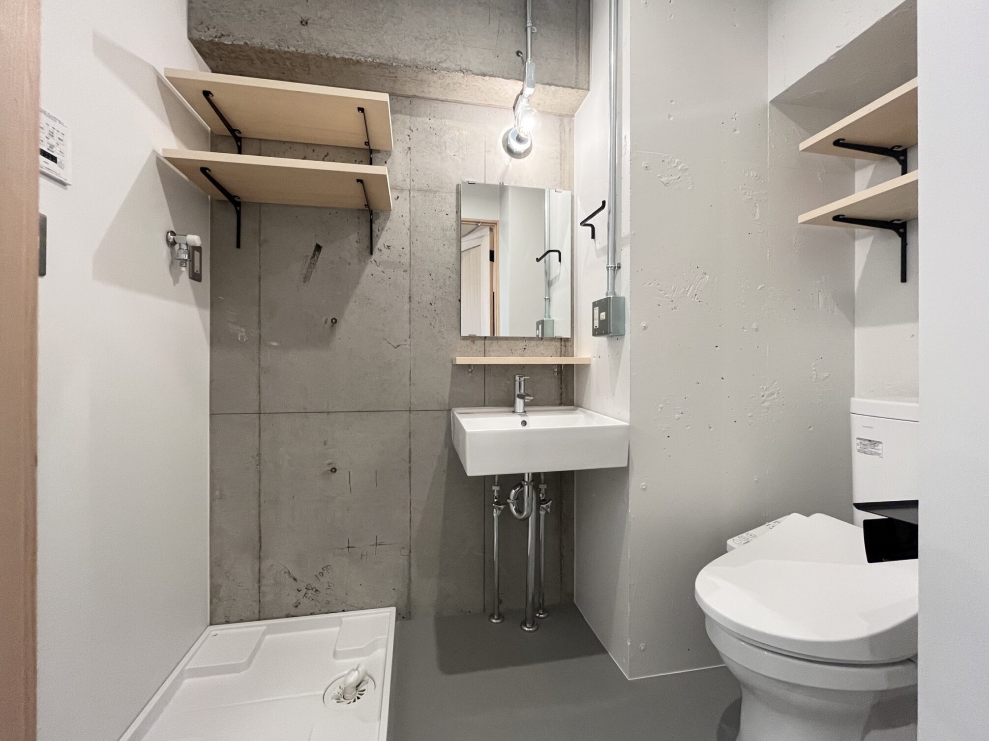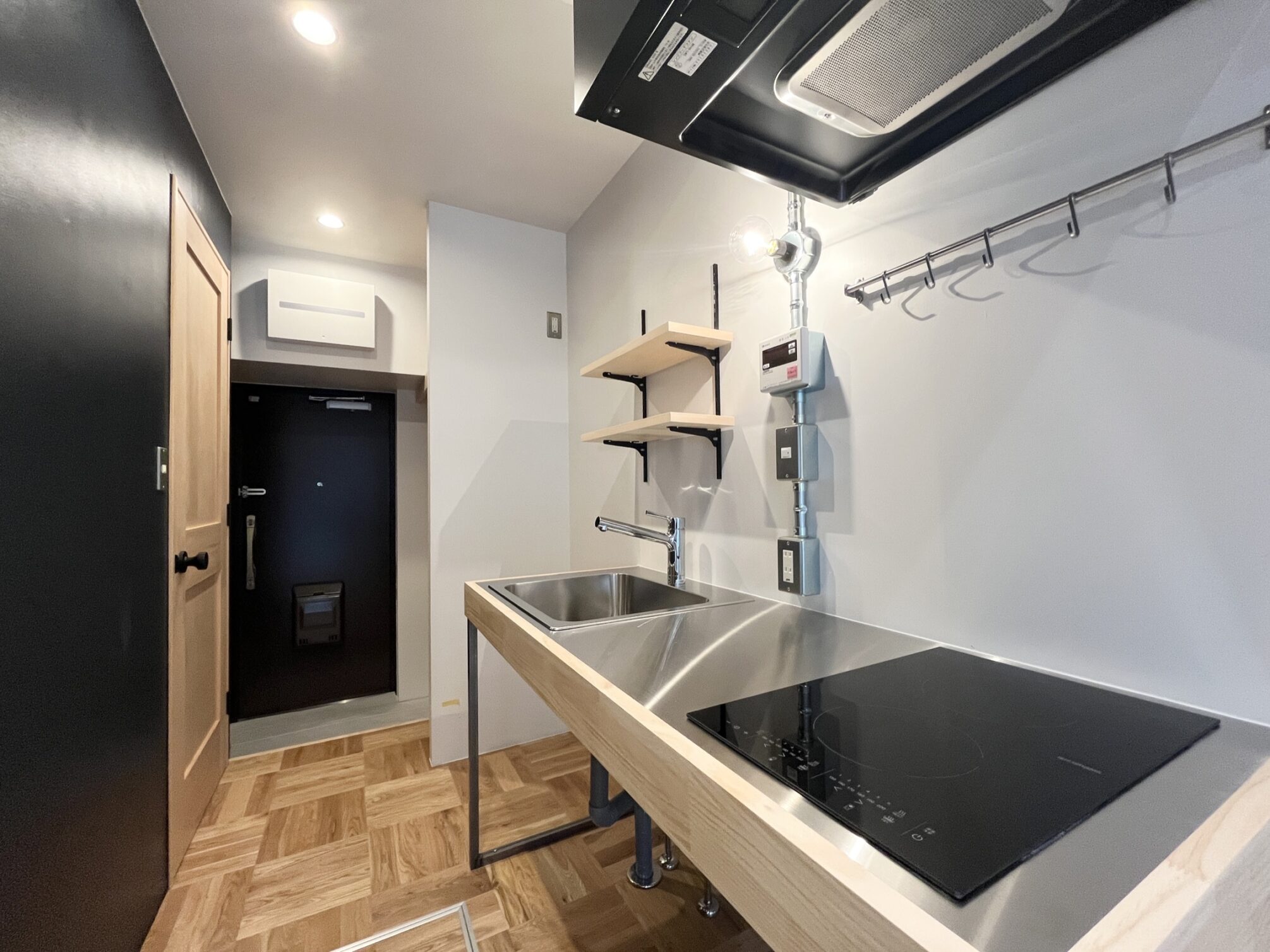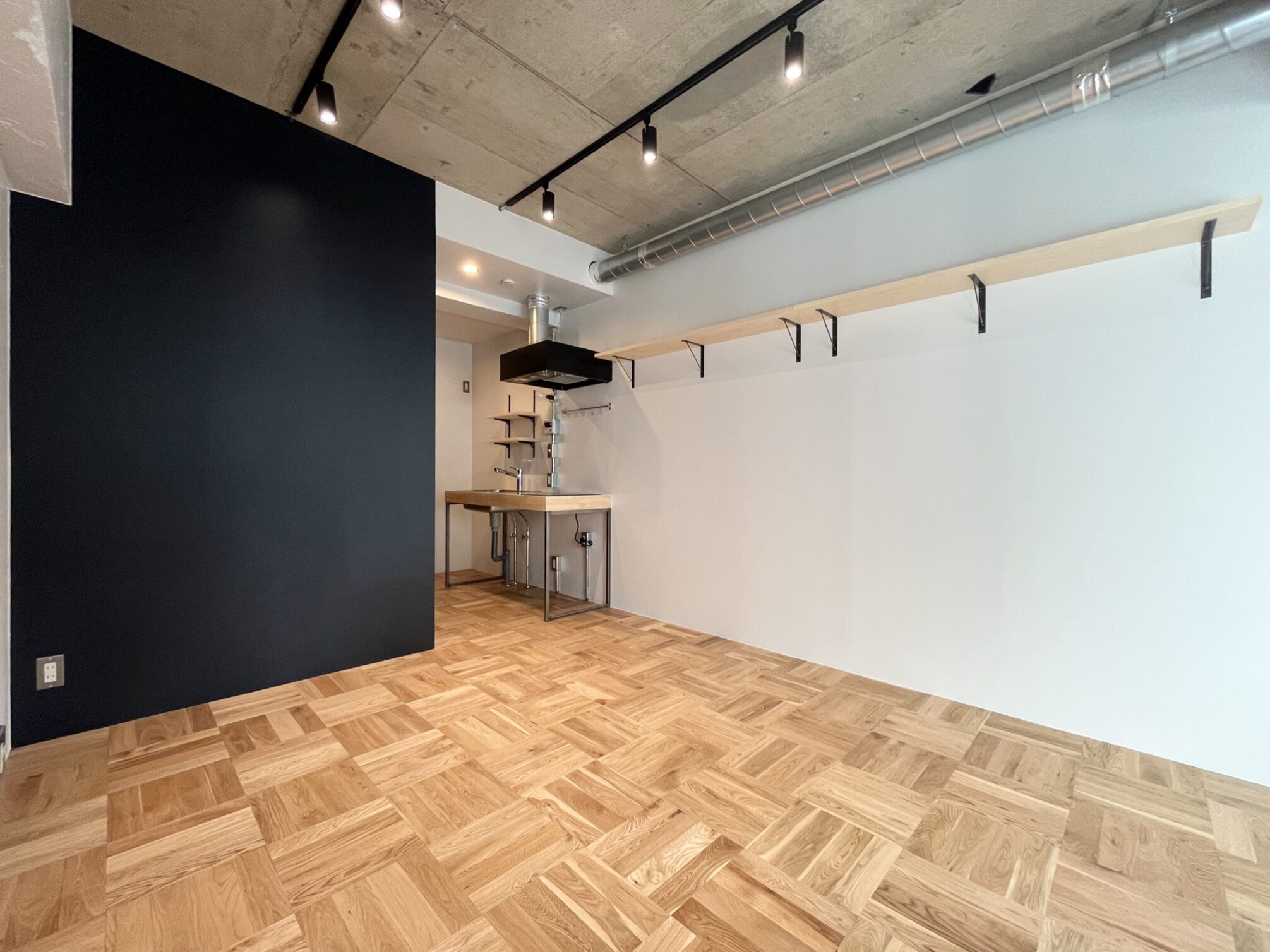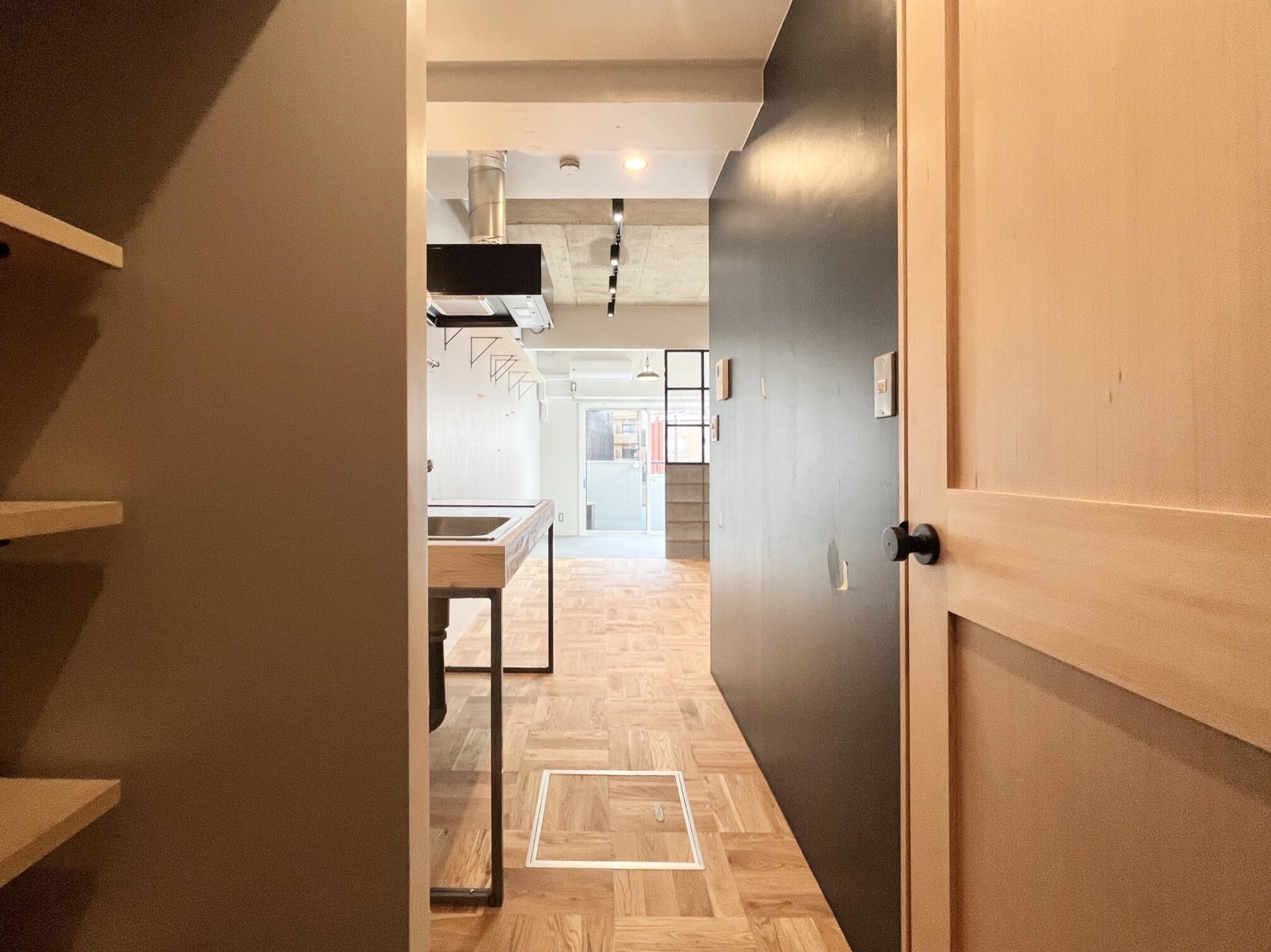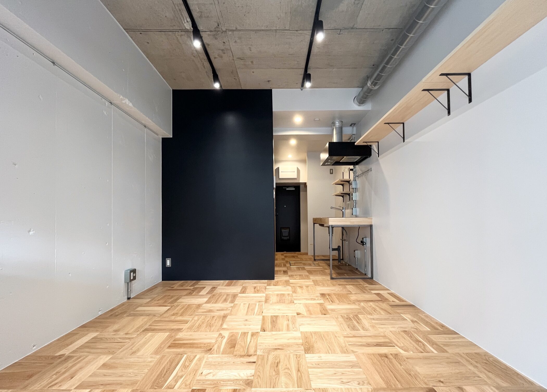 人通りが多く、下町風情のある賑やかな「新板橋」駅。公園など自然も多いが商店街も多数存在しているため、買い物にも便利。いくつもの老舗の飲食店が今も風景に溶け込んだ趣のある街。そんな新板橋にリノベーションシリーズ「Union」があります。ゾーニングされた居室の使い方の想像がふくらむ、そんな空間に仕上がりました。玄関に入り、手前側に水回りや収納もまとめたプランニング。メインの収納を玄関スペースにすることで居室部分に生活感を持ち混みにくくしています。居室部分はベッドスペースとリビングスペースを造作の格子棚と床の切替でゾーニングしています。リビングスペースは無垢材、窓際はタイルを採用。窓際にベッドを置いて生活感を見えにくくするのも良し、窓際にテーブルを置いてひだまりでコーヒーを飲みながら過ごすなんていうのも良し。思い思いに気持ちよく過ごせるお部屋です。タイルと無垢材、コンクリートの壁、黒に塗装された金属など、色と素材の組み合わせがモダンなテイストを醸し出します。この部屋のどこでどう過ごすかは想像力次第。自分らしい暮らしが送れる空間です。