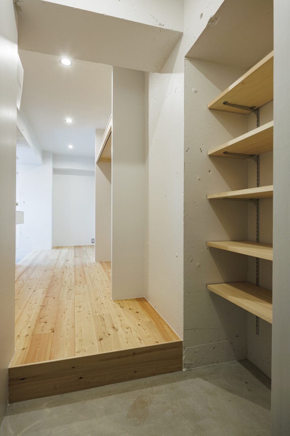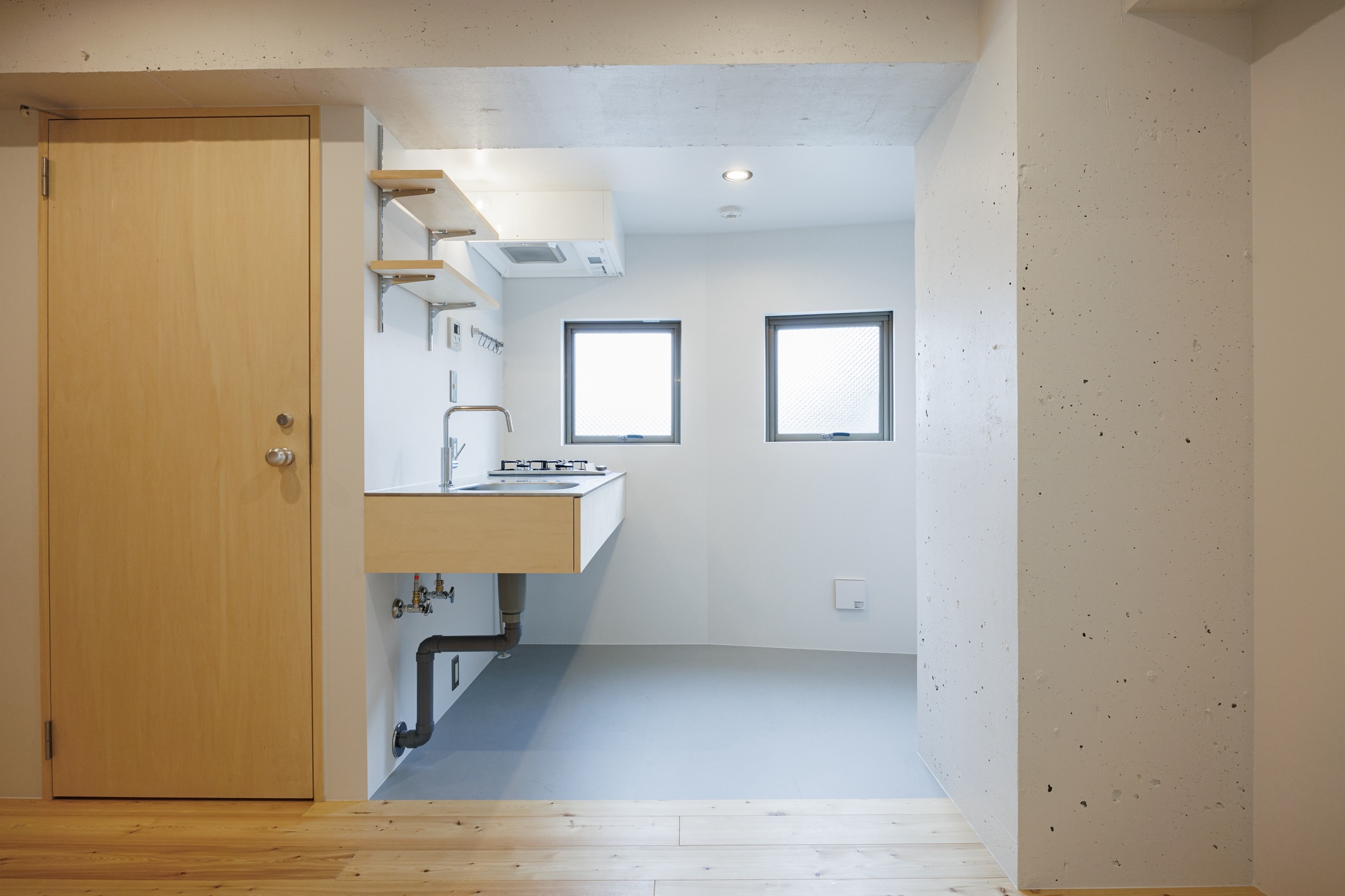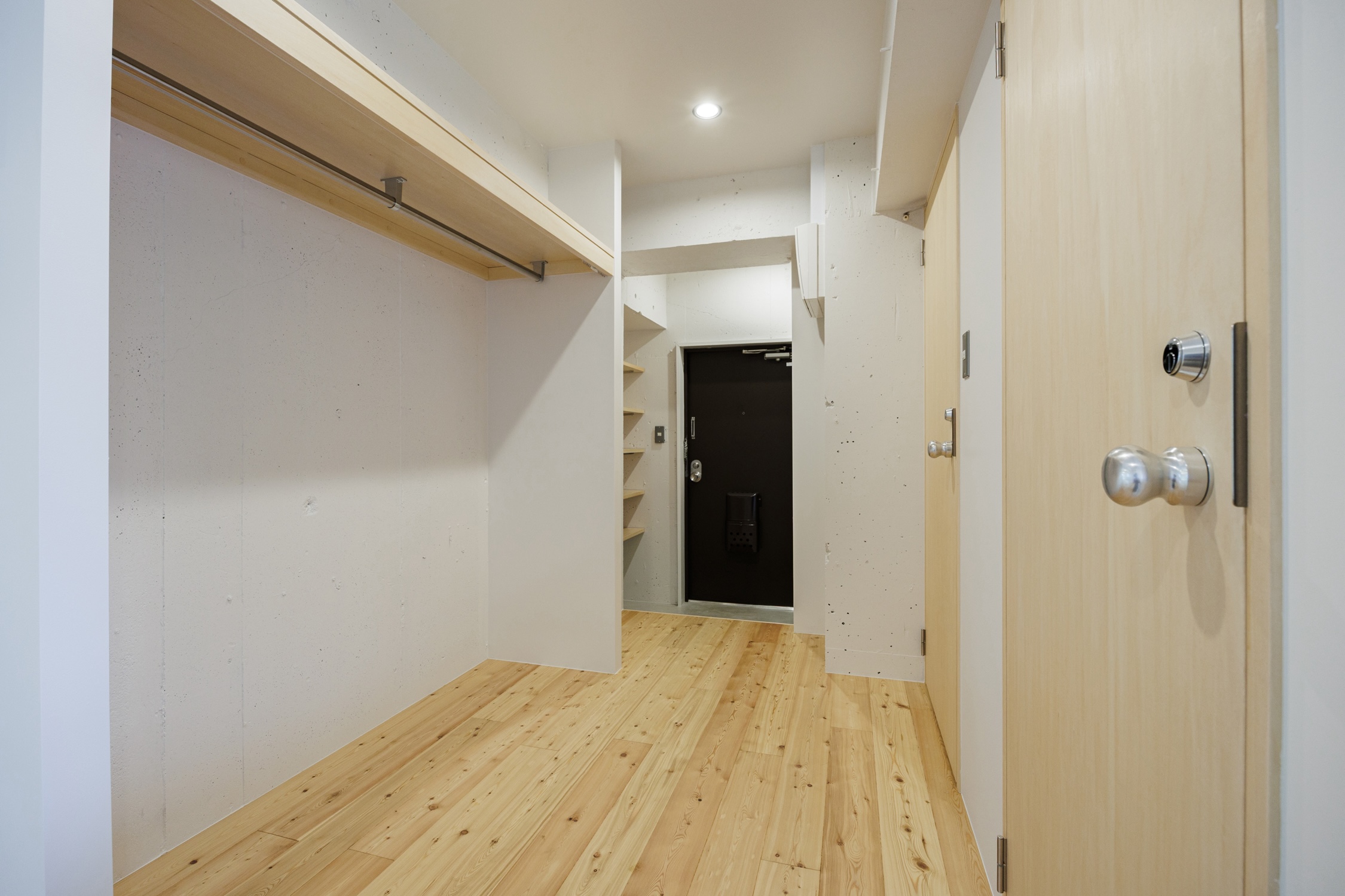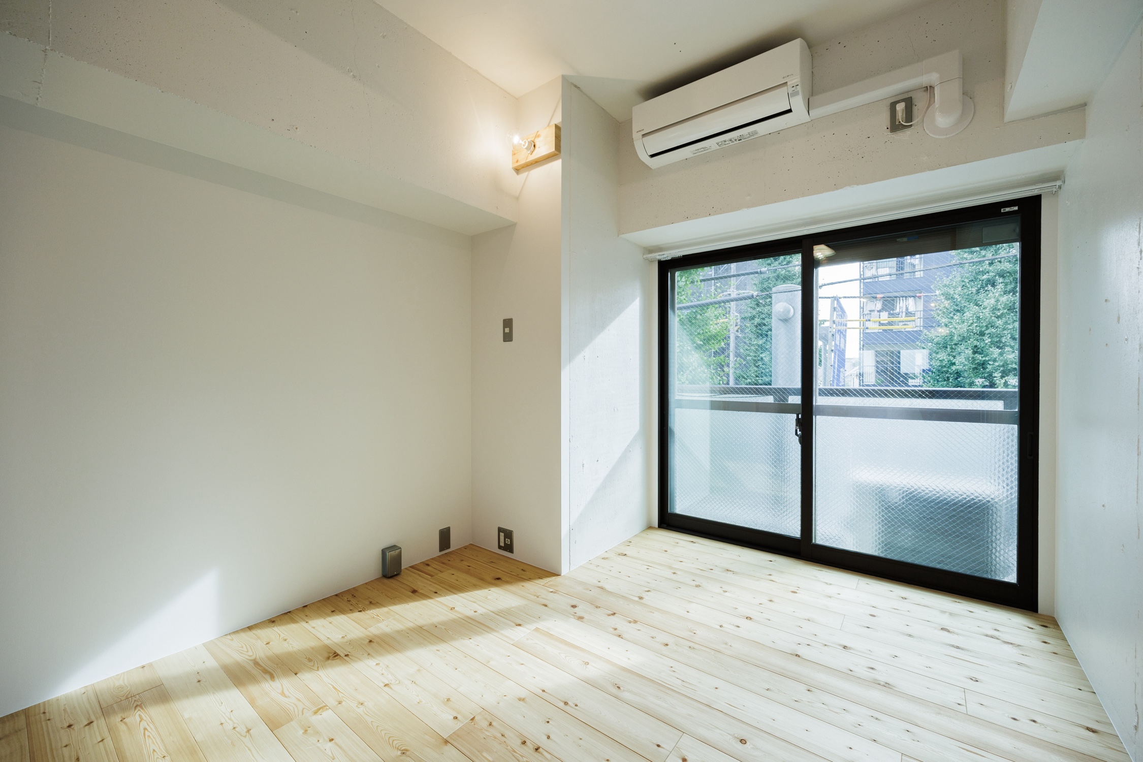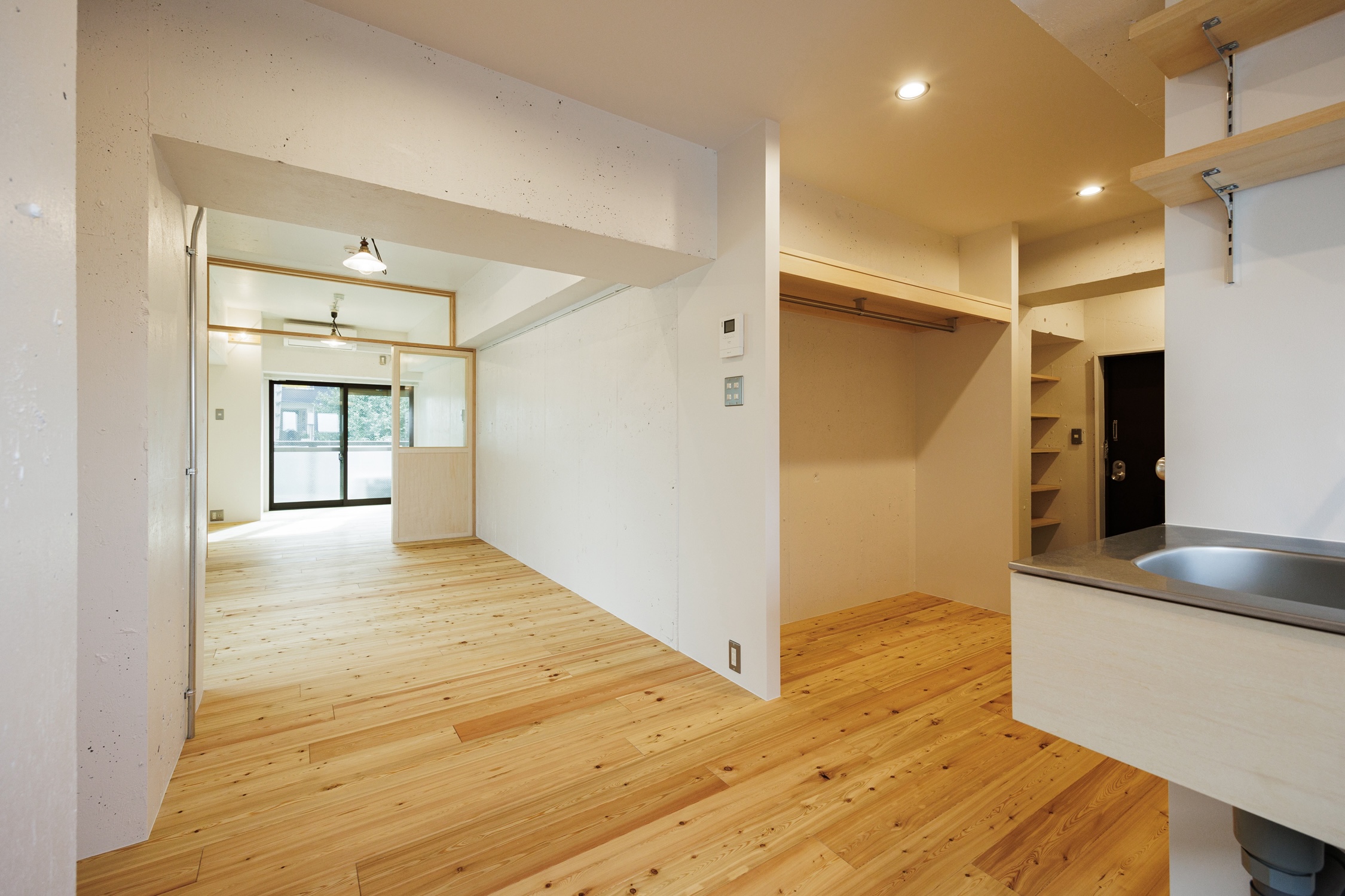 落ち着いた住環境と個性ある文化が同居している西荻窪。都会の便利さを享受しつつ、自分らしい暮らしを楽しみたい人におすすめのエリアに「Wasabi」シリーズがあります。L字型の特徴的な間取りのお部屋は窓が点在し、自然光が程よく差し込む気持ちの良いお部屋。収納は玄関入ってすぐの位置に設置。カーテンレール付きで見た目が気になる方は隠して収納することも可能です。水回りは手前側にコンパクトにまとめ暮らしやすい動線を実現しています。キッチンは既存の小窓や窪みを活かして、奥まった位置に。区切られた空間で料理に没頭できそうな予感がします。お部屋の奥へ進むとWasabiの特徴の一つ、ガラス戸の間仕切りが見えてきます。バルコニー側を寝室的に利用すれば、ガラス戸で仕切ってゾーニングが可能。来客が多い方も安心です。温かな素材感の無垢床やスポットで使われた壁付の照明などこだわりが散りばめられた余白を楽しめる空間で暮らしてみませんか。